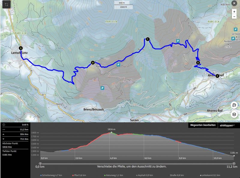Außerdem klettern wir nicht die Geröllrinne ab, sondern folgen dem Nordwestgrat etwas weiter nach unten, bevor wir ihn verlassen. Auf diesem Weg kommt man sicherlich auch leichter noch oben als durch die Rinne. Anschließend queren wir erneut das Gipsfeld und kehren bis zur Mäschenfurgga zurück. Hier steigen wir dann aber nicht durch das Tälchen nach Mäschenboden ab, sondern wandern über Ducanfurgga, Fanezfurgga, Fanezmeder und Oberalp zurück nach Monstein. Auf dem Wanderweg zur Ducanfurgga, vor uns liegt das Chrachenhorn: