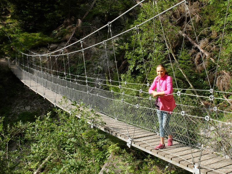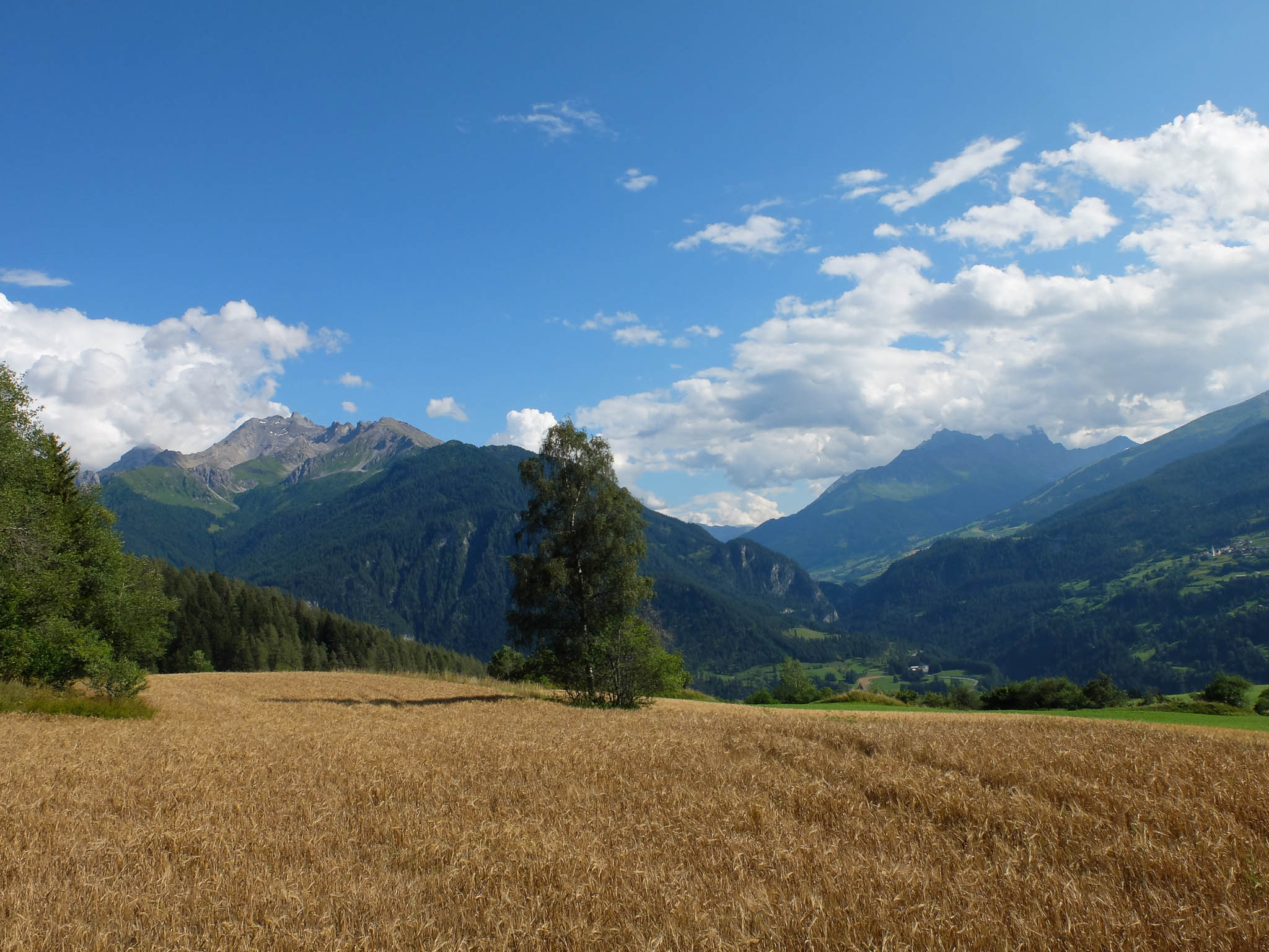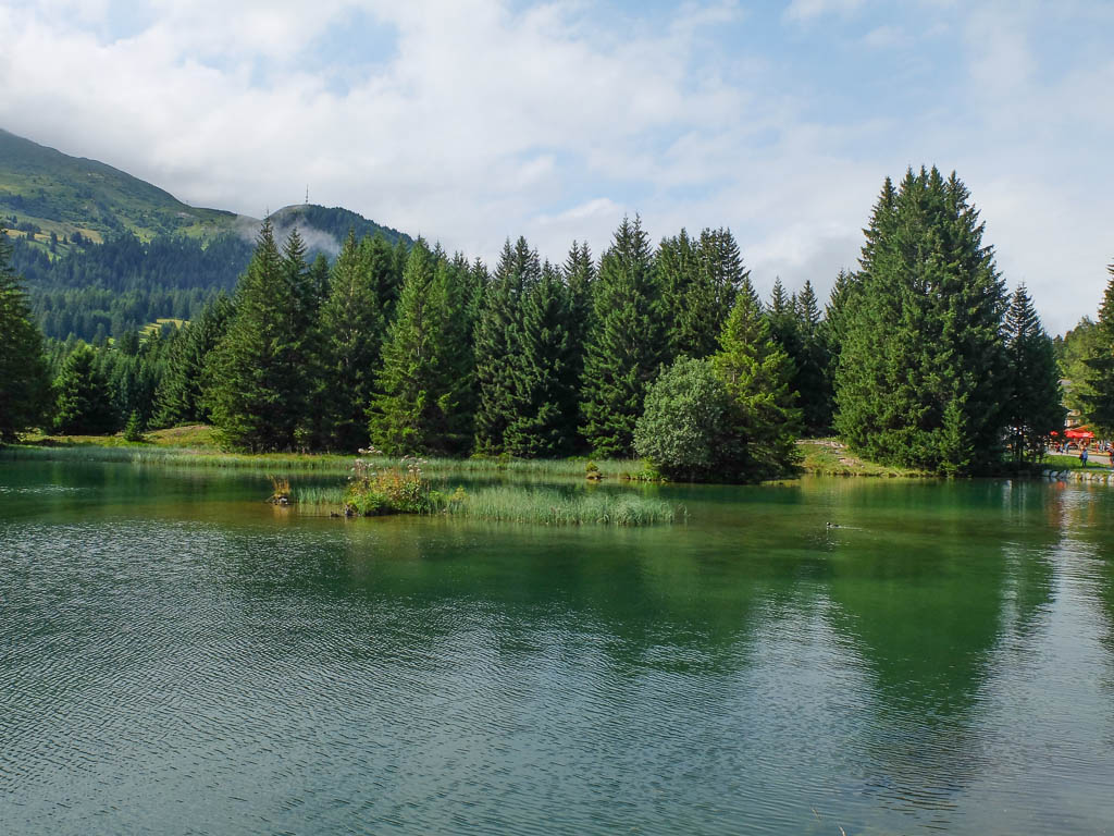 In der Nacht regnet es ziemlich heftig, aber schon am frühen Morgen verschwinden alle Regenwolken und es ziehen nur noch kleinere und größere Quellwolken über den Himmel. Das Wetter ist also perfekt für die Besteigung eines weiteren Gipfels in Graubünden, den 2764 Meter hohen Sandhubel. Startpunkt unserer Wanderung ist an der Bushaltestelle „Kirche“ in Davos Wiesen. Von dort aus geht es zu Beginn auf einem Fahrweg, aber schon nach 500 Metern auf einem schmalen Waldweg hinauf zur Wiesner-Alp. Der Blick zurück auf die Kirche von Davos Wiesen: