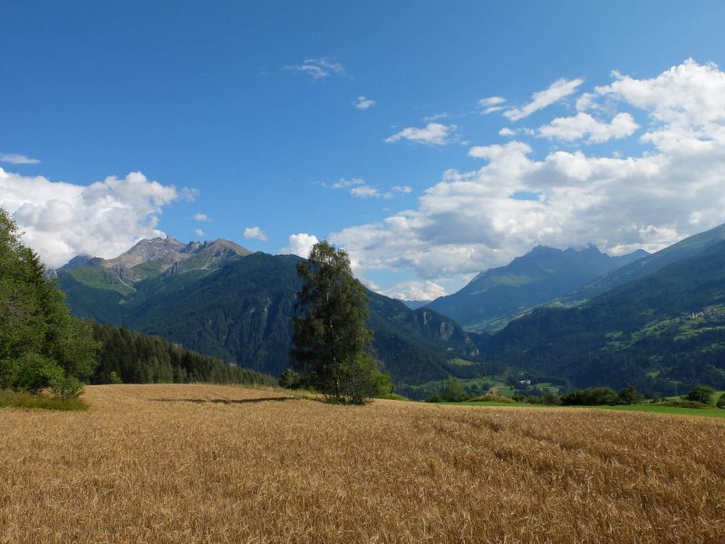 Von der Wiesner-Alpe aus geht es dann auf einem schmalen Bergweg hinauf zur 2555 Meter hoch gelegenen Valbella Furgga, einem zwischen den beiden Bergen Valbellahorn und Sandhubel gelegenen Übergang von der Wiesner-Alpe nach Altein Tiefenberg, einem Alpplateau in der Strelakette, von wo aus man weiter nach Arosa wandern kann. Der Blick zurück vom Bergweg auf die Wiesner-Alpe, im Hintergrund ist das Dreigestirn Piz Ela, Tinzenhorn und Piz Mitgel zu sehen: