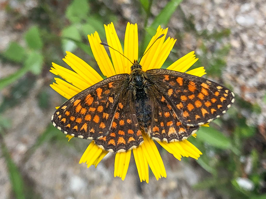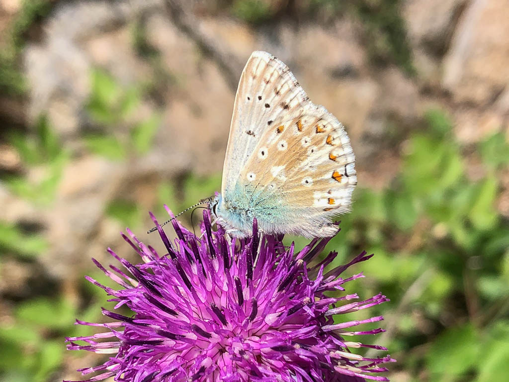 Der Wetterbericht sagt für den Nachmittag anhaltenden Regen vorher, aus einer längeren Tour wird daher nichts. So bleiben wir in der Nähe, fahren mit dem Postbus „nur“ nach Davos-Wiesen und laufen von dort aus nach Hause zurück. Wir lassen uns dabei sehr viel Zeit, rasten zwischendurch auf einem Bänkchen und können dabei sogar ein paar Sonnenstrahlen genießen. Zahlreiche Alpenblumen schmücken die Wegränder und werden von den verschiedensten Schmetterlingsarten umschwärmt. Mit Schmetterlingen kenne ich mich nicht besonders gut aus, aber ich versuche, wenigstens ein paar von ihnen näher zu bestimmen. So könnte dies ein Scheckenfalter sein, der auf einem Ochsenauge sitzt: