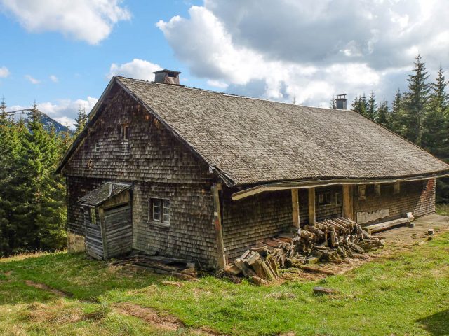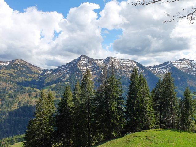 Auf dem Weg zum Naturfreundehaus Kempten, der Blick auf die Mittelberg-Alpe mit Stuiben und Sedererstuiben im Hintergrund:
