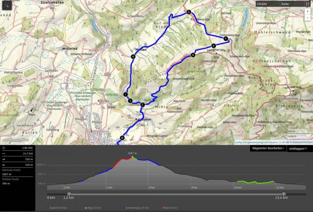 Für die rund 20 Kilometer lange Strecke benötigten wir fünfeinhalb Stunden. Von Immenstadt aus fuhren wir um 20.05 Uhr mit der Bahn wieder zurück nach Oberstaufen. Mein Fazit der Wanderung: Sehr empfehlenswert, vor allem um diese Jahreszeit, wenn man wie wir die Ruhe liebte: Fünf Stunden lang war nur das Zwitschern der Vögel und das Rauschen der Bäche zu hören. Wildkräuter aß ich unterwegs keine, ich trank aber den ein oder anderen Schluck frisches Gebirgswasser. Meine Mahlzeiten: