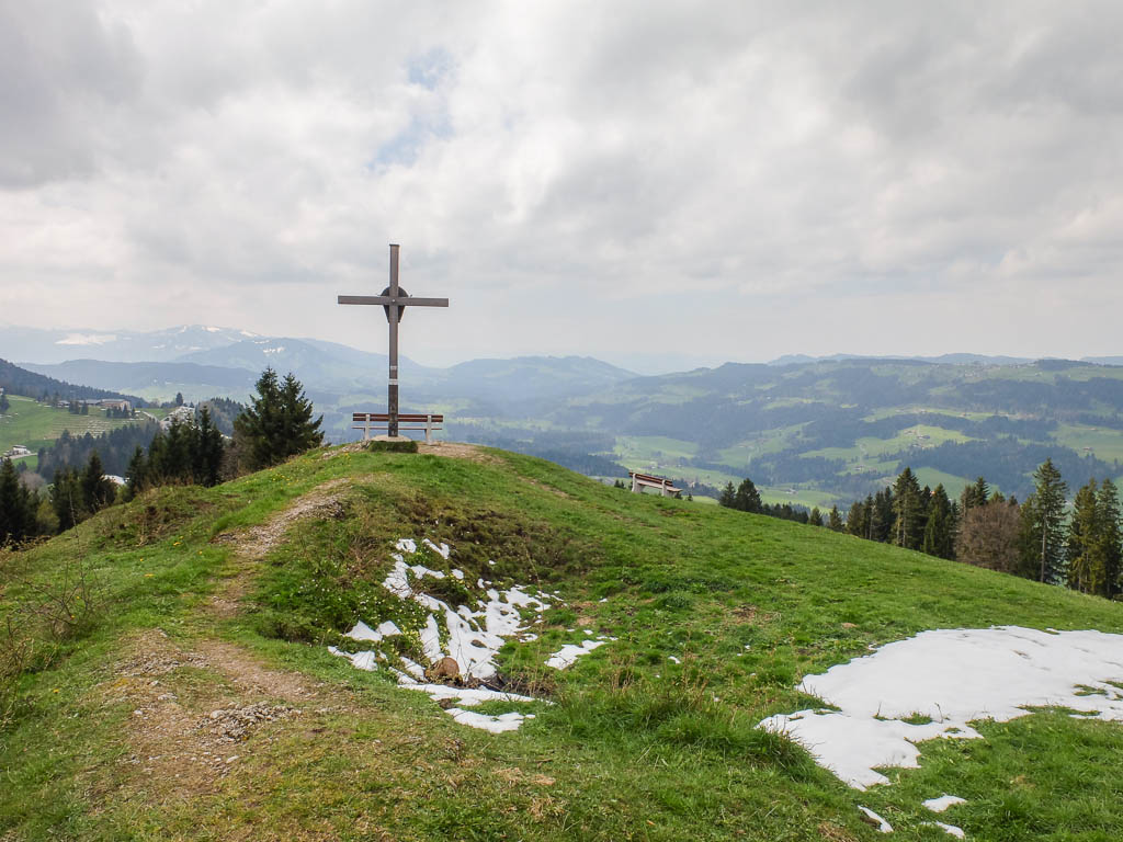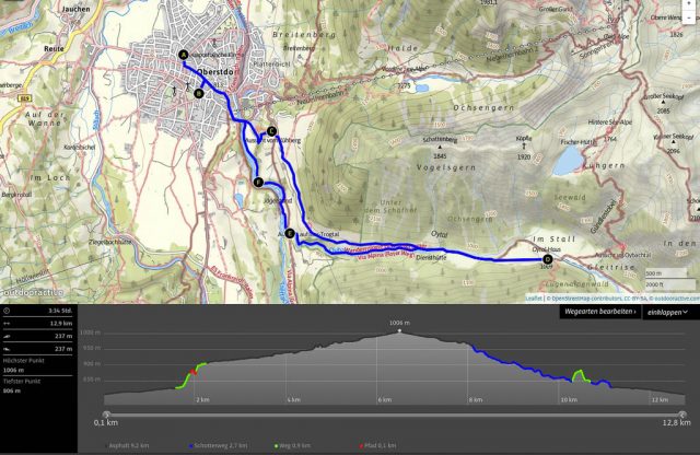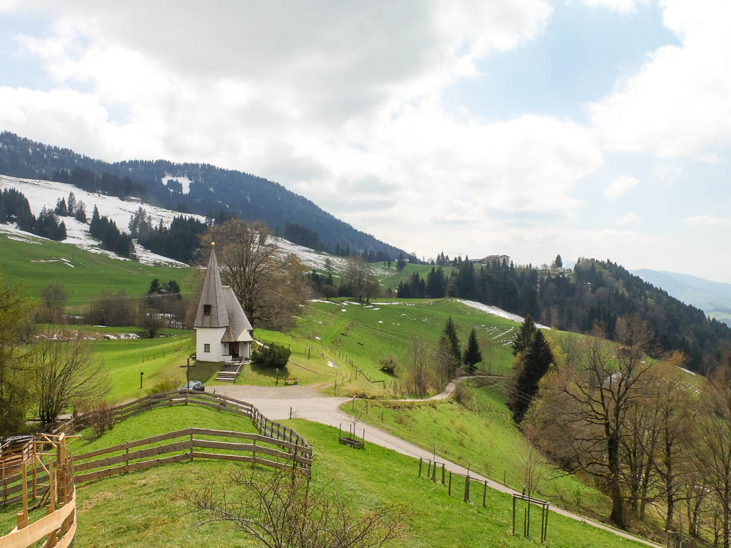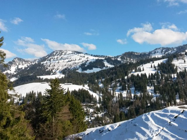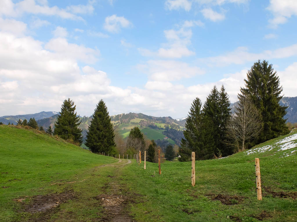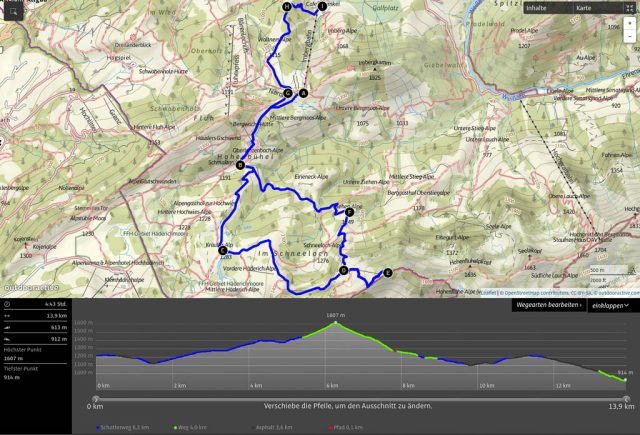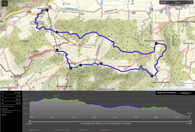 Die Idee, Sapotillen statt der nicht mehr erhältlichen Sapote „Chico“ zu bestellen, erwies sich als goldrichtig. Die Sapotillen schmeckten nämlich ebenso genial. Die Portion war zwar recht klein, weil die meisten Früchte für meinen Geschmack noch nicht reif genug waren, aber trotzdem sehr befriedigend. 415 Gramm Bananen „Cavendish“ und 65 Gramm Cashewkerne bildeten zwischen 15.40 und 16.15 Uhr die nächste Mahlzeit. Zwischen 16.30 und 18.30 gab es während eines Spaziergangs am Hündle reichlich frische Luft und ein paar Wildkräuter. Mit dabei waren Löwenzahnblüten, sie schmeckten immer noch nach Schokolade, Brennnesselspitzen und Triebspitzen der Knoblauchsrauke. Unser Spaziergang führte von der Bergstation der Hündlebahn über die Moos-Alpe zur Talstation: