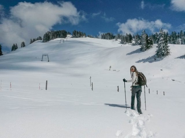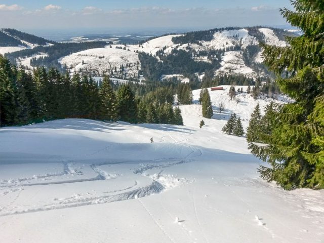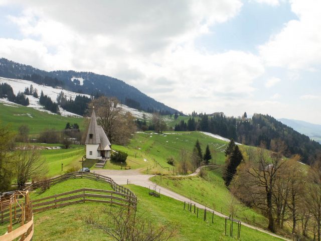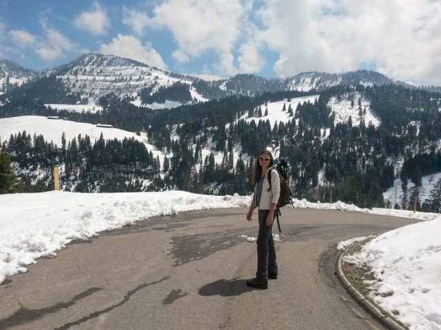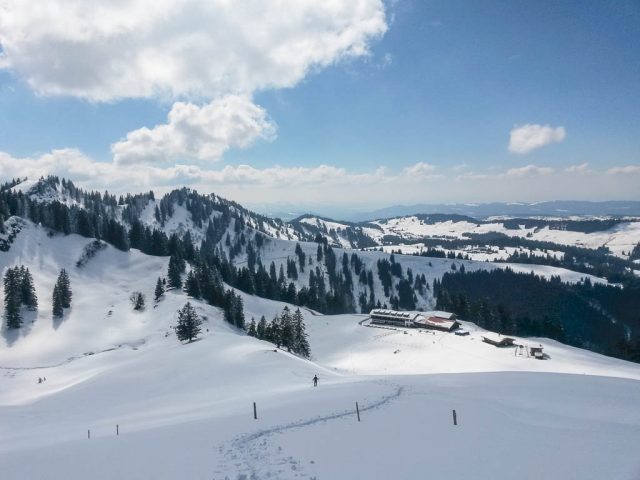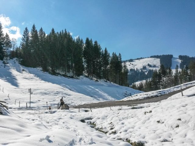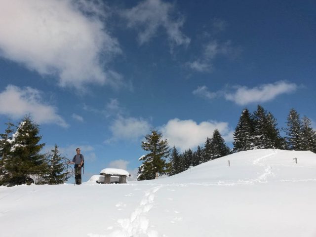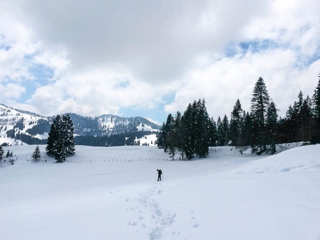 Die Idee, Sapotillen statt der nicht mehr erhältlichen Sapote „Chico“ zu bestellen, erwies sich als goldrichtig. Die Sapotillen schmeckten nämlich ebenso genial. Die Portion war zwar recht klein, weil die meisten Früchte für meinen Geschmack noch nicht reif genug waren, aber trotzdem sehr befriedigend. 415 Gramm Bananen „Cavendish“ und 65 Gramm Cashewkerne bildeten zwischen 15.40 und 16.15 Uhr die nächste Mahlzeit. Zwischen 16.30 und 18.30 gab es während eines Spaziergangs am Hündle reichlich frische Luft und ein paar Wildkräuter. Mit dabei waren Löwenzahnblüten, sie schmeckten immer noch nach Schokolade, Brennnesselspitzen und Triebspitzen der Knoblauchsrauke. Unser Spaziergang führte von der Bergstation der Hündlebahn über die Moos-Alpe zur Talstation: