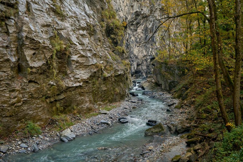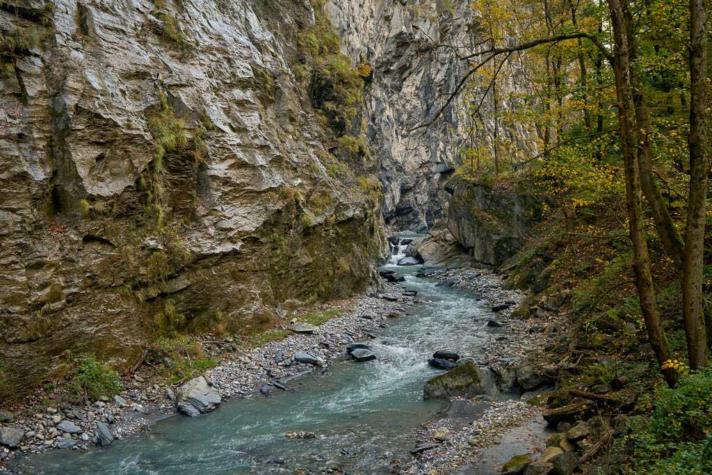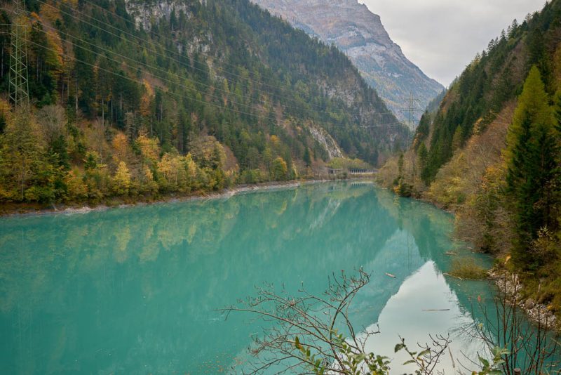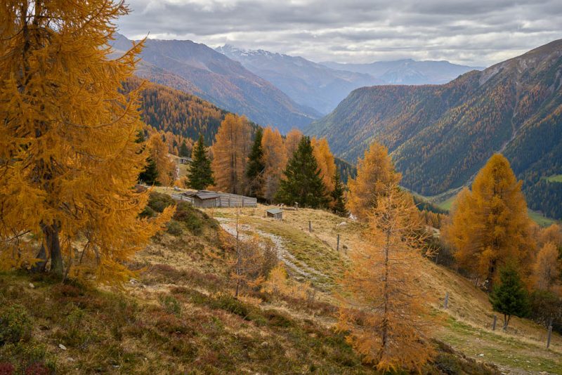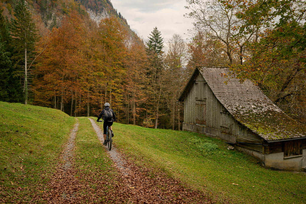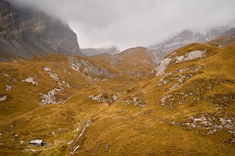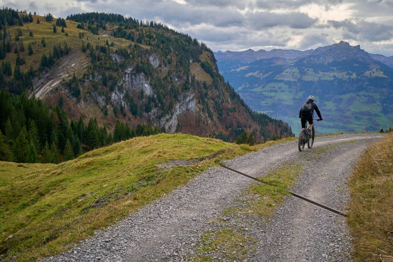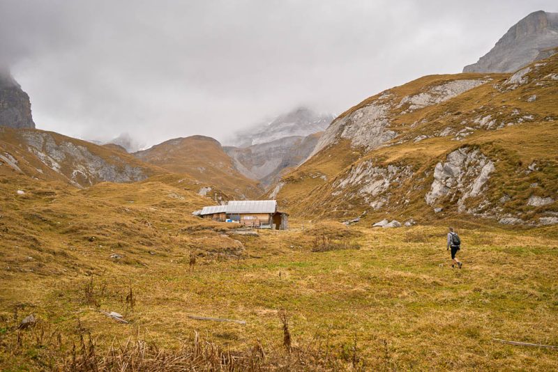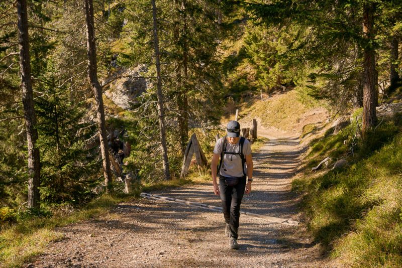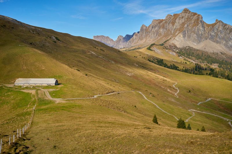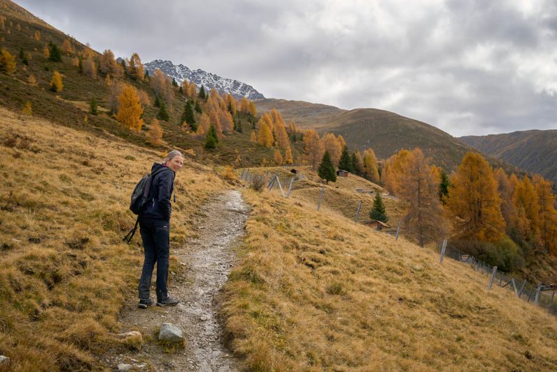 Bei der Alp Afein nehmen wir nicht den nach oben führenden Wanderweg, sondern laufen über eine Spur, die der Alphirte im Sommer mit seinem Fahrzeug hinterlassen hat: