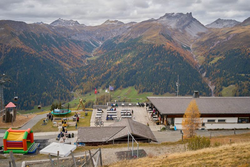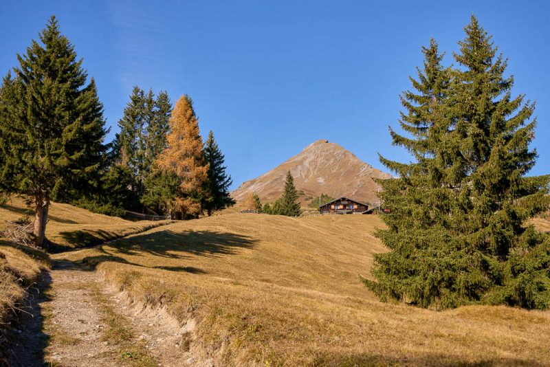 Der Tiaun mit dem vorgelagerten Hübel ist für mich so etwas wie der Hausberg von Schmitten. Von der Schmittner Alp aus gesehen ist er jedenfalls der Gipfel, der von den Gipfeln des Guggernellgrats am deutlichsten ins Auge springt. Meine erste Besteigung des Tiauns im Jahr 2024 fand am 28. Juni statt: Wanderung auf den Tiaun. Mein „Soll“ war damit für dieses Jahr erfüllt. Guido hingegen, der im letzten Jahr gleich an drei aufeinanderfolgenden Tage auf dem Gipfel stand, kam aufgrund zahlreicher anderer Aktivitäten dieses Jahr noch nicht in den Genuss einer Besteigung. Das soll sich heute ändern: Bei wunderschönen Herbstwetter starten wir um kurz vor 12 Uhr von Schmitten aus zu einer Besteigung des Tiauns. Der kürzeste Weg für Wanderer führt über Pardela. Der Blick vom alten Pardelaweg auf Jenisberg: