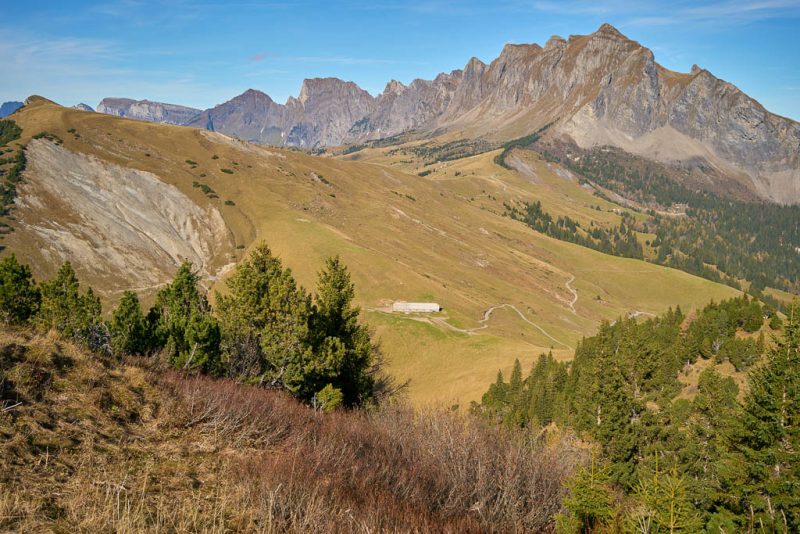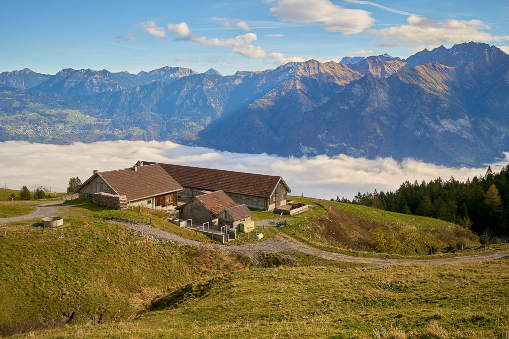 Von der Schmittner Alp aus geht zügig weiter hinauf zur Alp Afiein, erst ein Stück auf dem Fahrweg, dann weglos querfeldein: