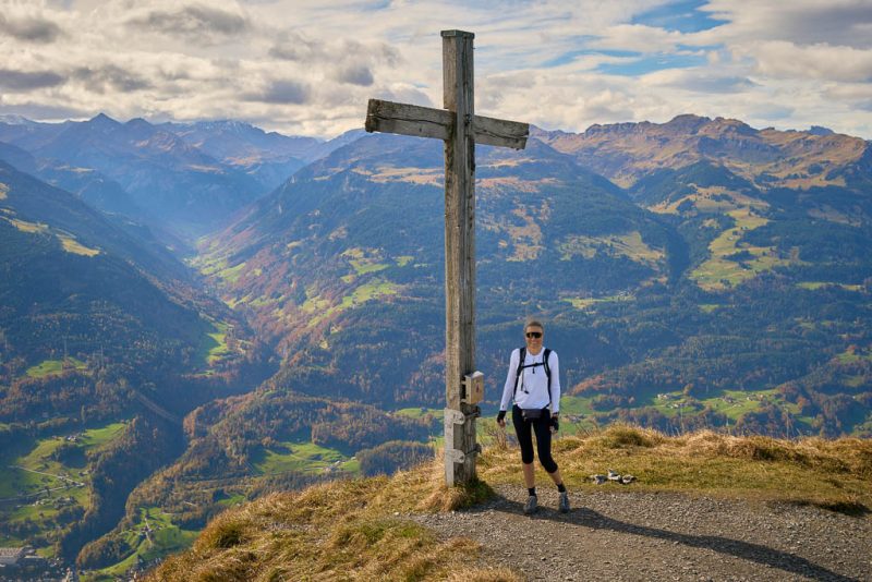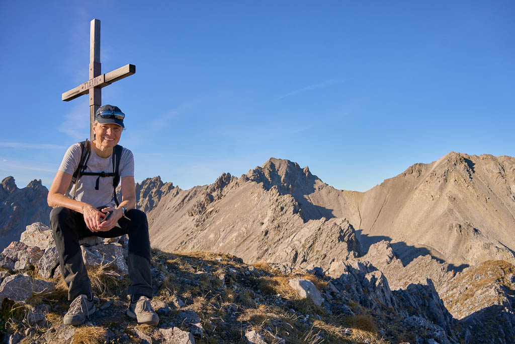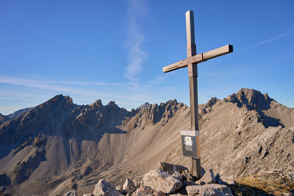 Nach zwei Stunden und fünfundvierzig Minuten habe aber auch ich es geschafft, das Gipfelkreuz des Tiauns steht vor mir: