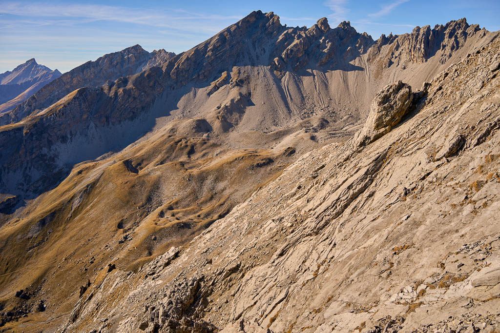 Der Aufstieg über den Westgrat ist nicht besonders schwierig. Ab und zu liegt Geröll im Weg, aber das kann man locker übersteigen. Anstrengend ist der Aufstieg trotzdem und je höher ich komme, desto öfters muss ich kurz anhalten und mich orientieren, wo es weitergehen soll. Der Blick vom Westgrat auf Blyberg und Schafläger, ganz links im Bild ist das Lenzer Horn zu sehen: