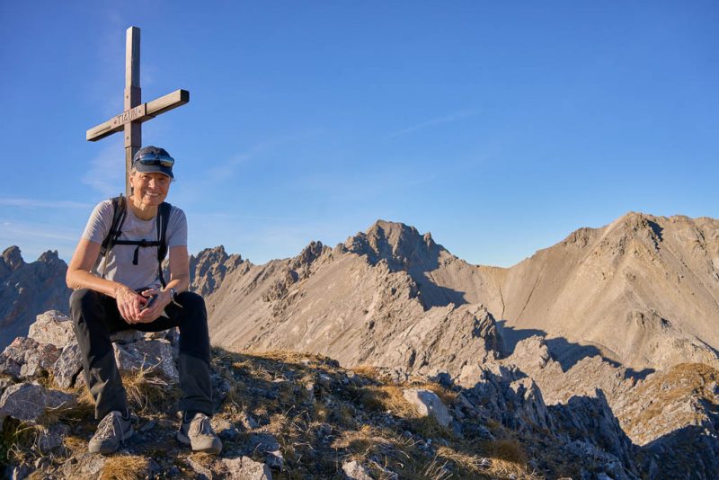 Nach dem Eintrag ins Gipfelbuch erhole ich mich zu den Füßen des Kreuzes sitzend vom anstrengenden Aufstieg: