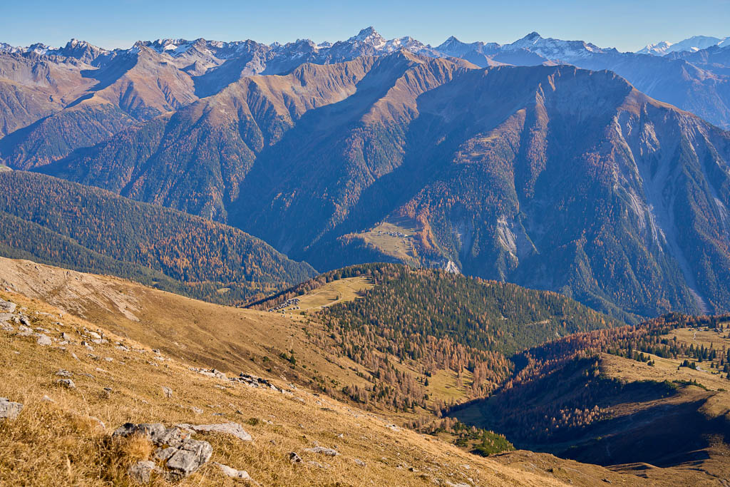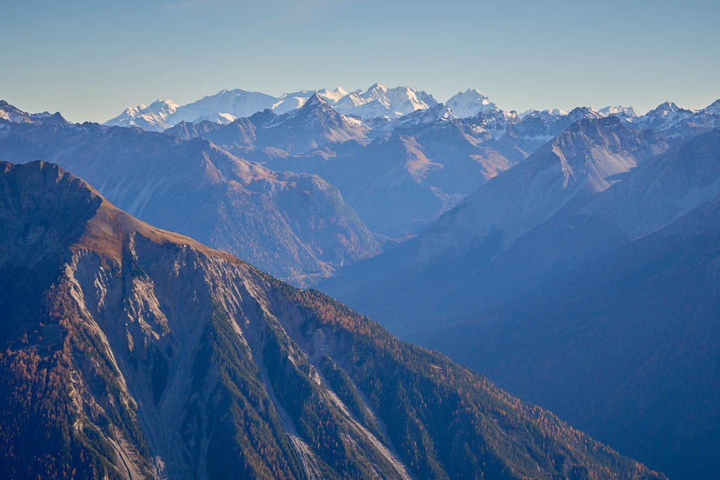Der Blick Richtung Südosten fällt auf die Wiesner Alp, Jenisberg und zahlreiche Gipfel, in der Bildmitte sticht der Piz Kesch hervor: