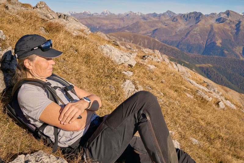 Eine gute halbe Stunden genießen wir nicht nur die Fernsicht, sondern auch die wärmende Herbstsonne:
