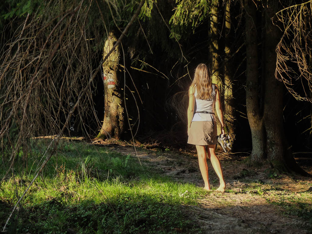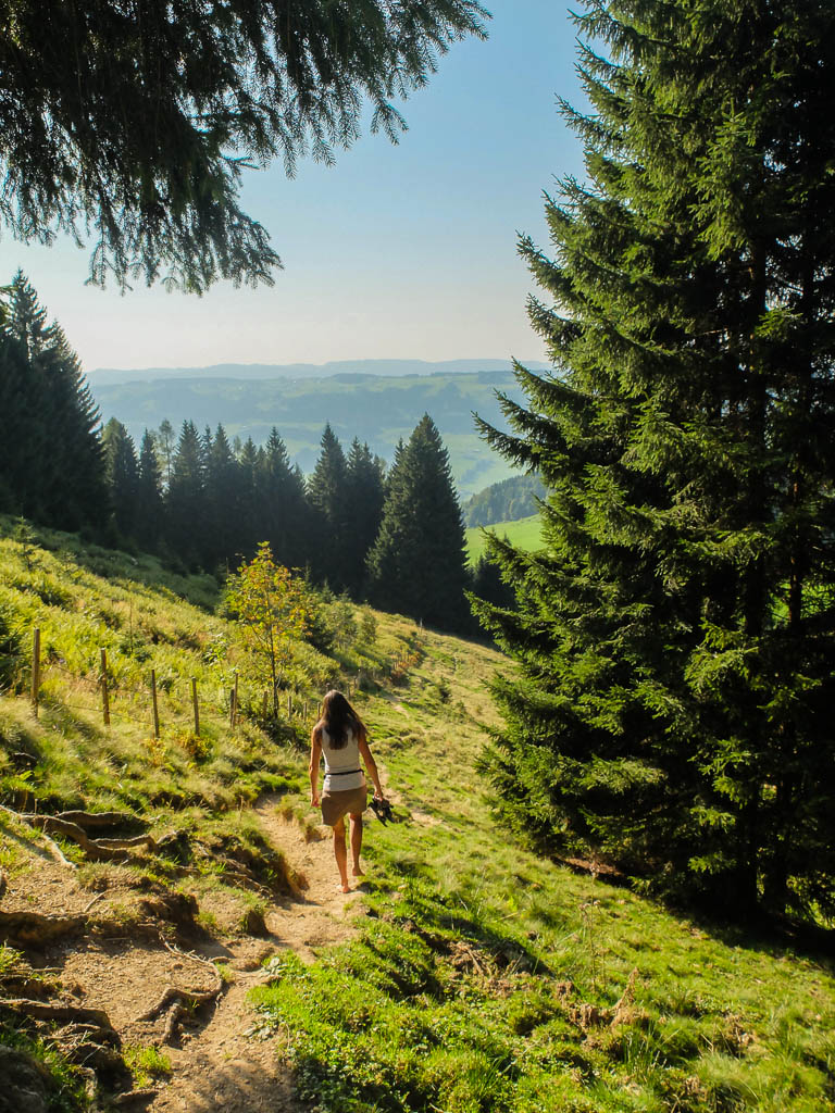 Der letzte Streckenabschnitt verlief auf schmalen Pfaden durch den Tobel des Steinebachs. Genau zum richtigen Zeitpunkt, nämlich kurz vor der Abfahrt des Busses nach Oberstaufen (er fuhr nur einmal pro Stunde) waren wir wieder am Bahnhof von Immenstadt. Der Abendhimmel bei unserer Ankunft in Oberstaufen war beeindruckend. In welche Richtung man auch sah, überall schwebten rosa Wolken: