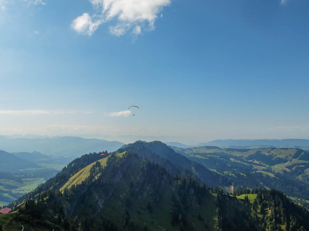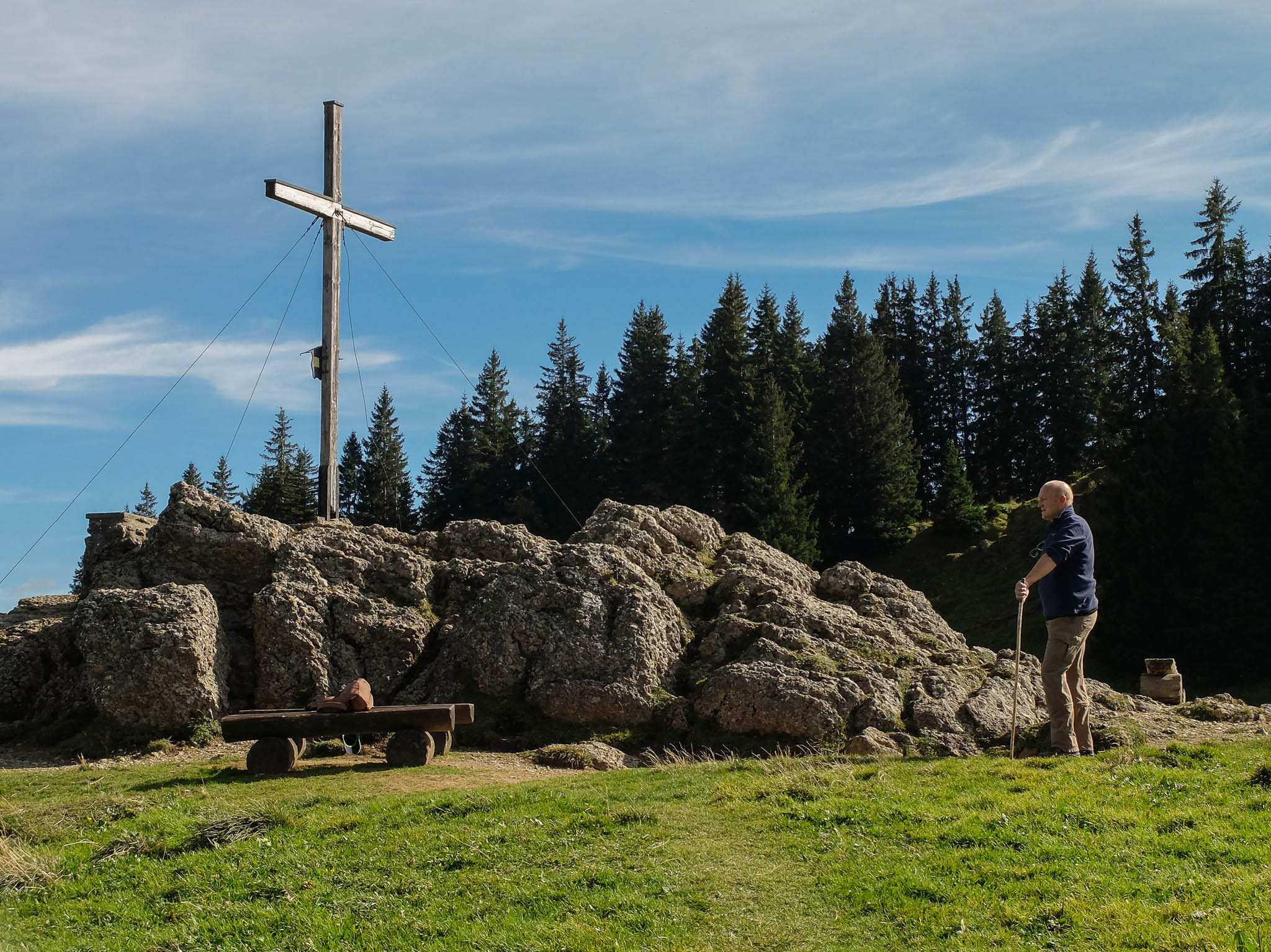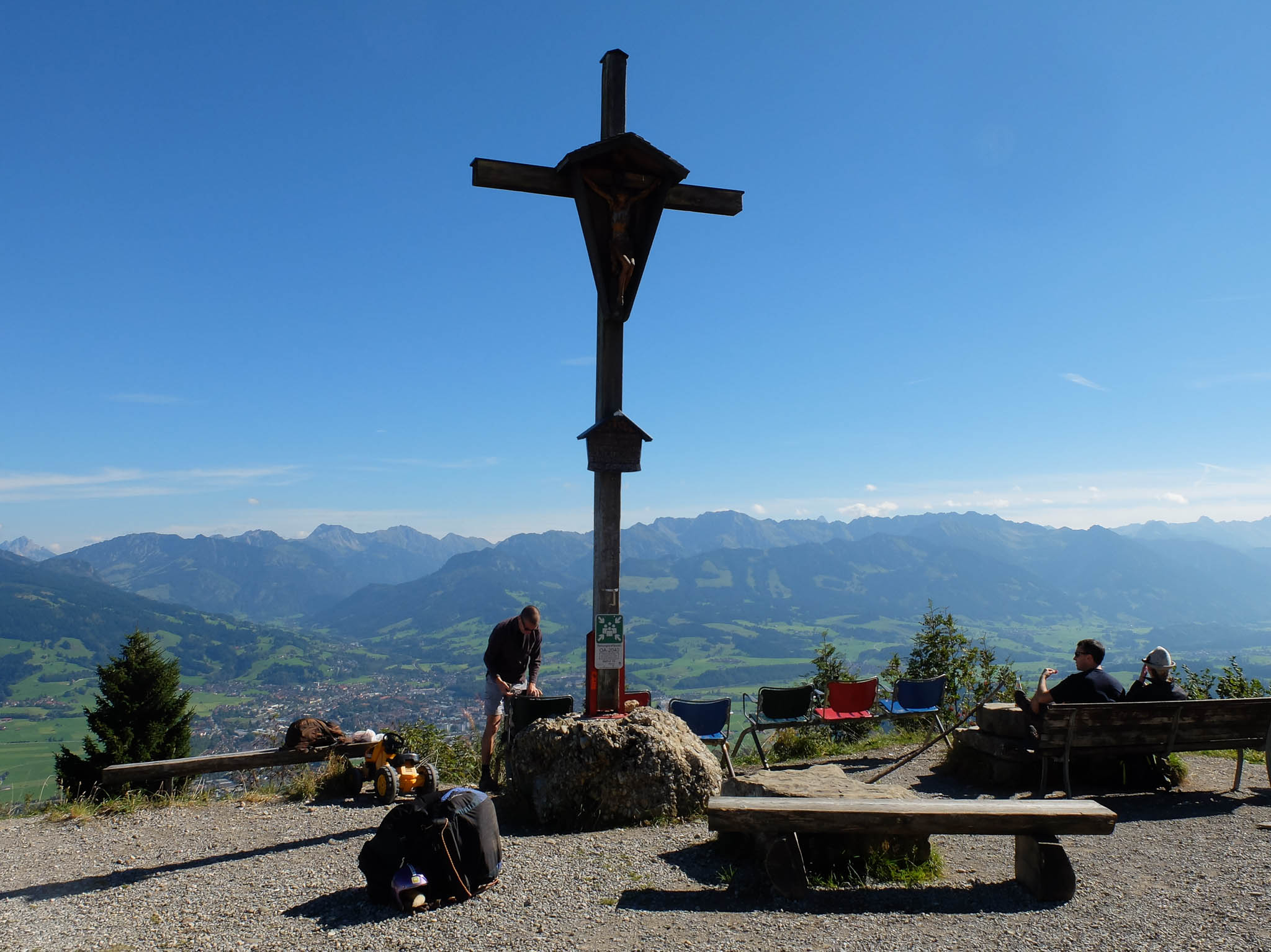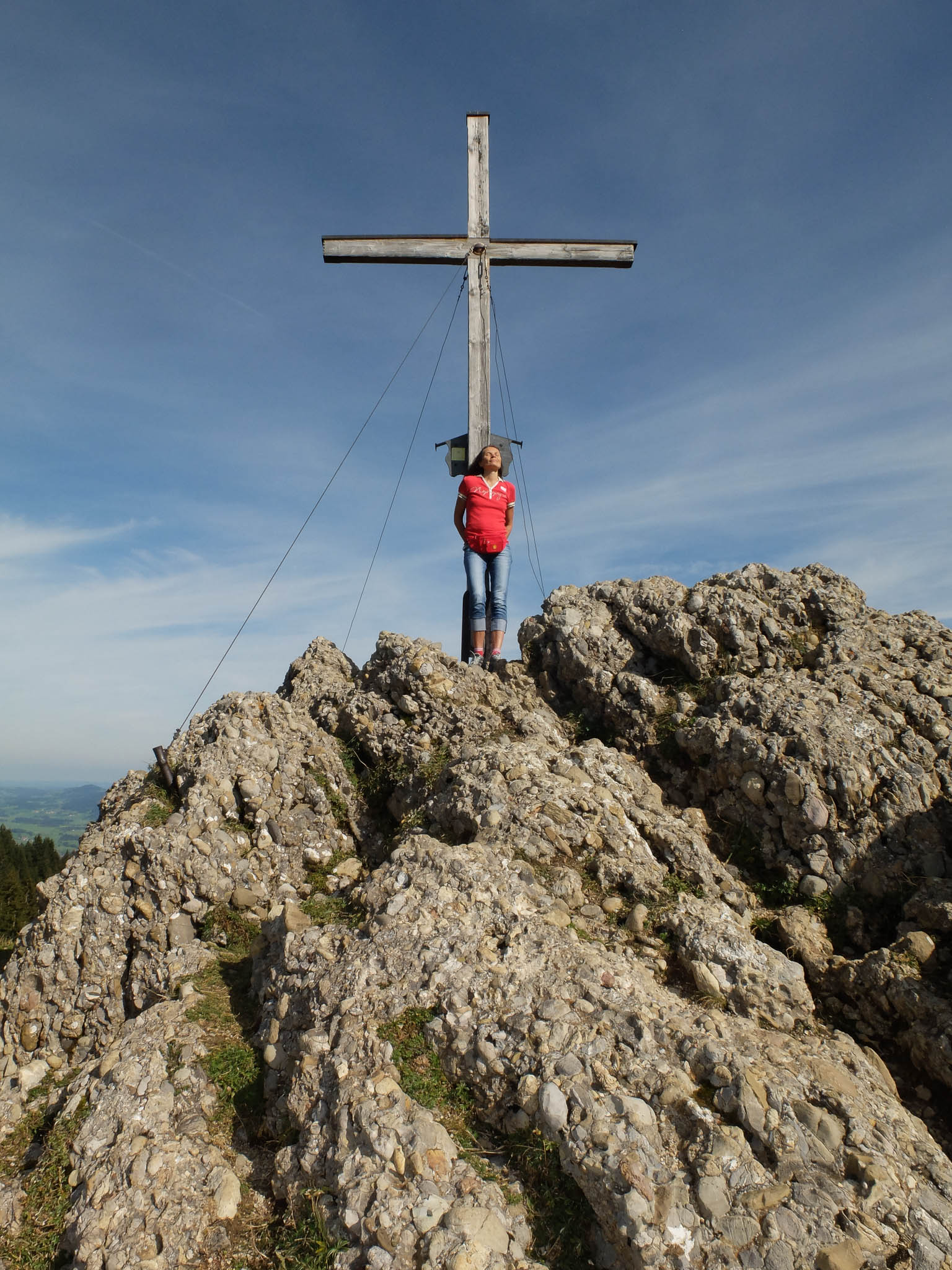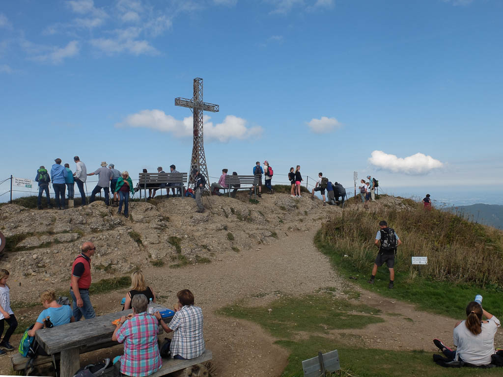 Ein paar Überraschungen, die den Tag zu einem besonderen Tag machten, gab es aber doch. So bekam ich gleich am frühen Morgen einen Anruf wegen eines Minijobs, für den ich mich beworben hatte. Im Obst- und Gemüseladen gab es die ersten Kakis, „richtige“ Kakis mit einer einwandfreien Sperre, wie ich später feststellen konnte. Und Guido hatte die schöne Idee, heute die Nagelfluhkette von Immenstadt aus zu erkunden. So fuhren wir um 11.35 Uhr mit dem Bus vom Oberstaufner zum Immenstädter Bahnhof und schaukelten kurze Zeit später mit der Mittagbahn auf den Mittagberg. Die „Bahn“ war nämlich ein Sessellift! Am Gipfelkreuz des Mittagbergs: