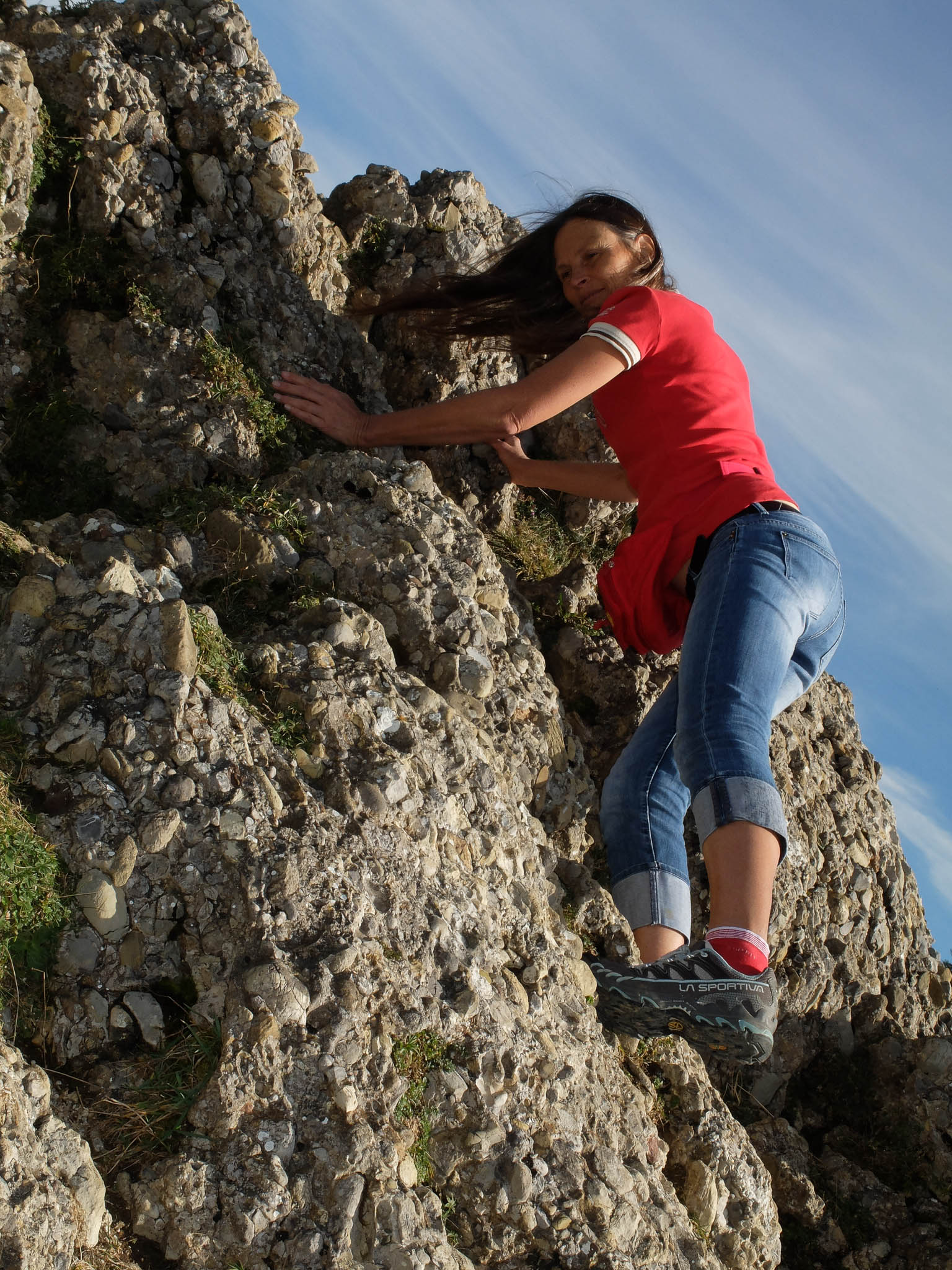 Sie waren perfekt reif, aber mehr als eine ging nicht. Eine kleines Stück musste ich sogar übrig lassen, weil es im Mundraum arg pelzig wurde. Zum Sattwerden aß ich hinterher etwa 500 Gramm Bananen „Cavendish“. Nach der Mittagspause am Mittagberg liefen wir über das Bärenköpfle, den Steineberg, die Gund- sowie die Mittelberg-Alpe und zum Schluss entlang des Steinebachtobels zurück zum Immenstädter Bahnhof. Die Streckenlänge betrug laut Runtastic-App, die wohlgemerkt nicht sehr genau war, 14 Kilometer (400 Meter aufwärts, 1111 (!) Meter abwärts). Mit vielen kleinen Pausen zum Genießen und Fotografieren der Landschaft benötigten wir gut vier Stunden für diese Strecke. Alpine Kletterei am Bärenköpfle: