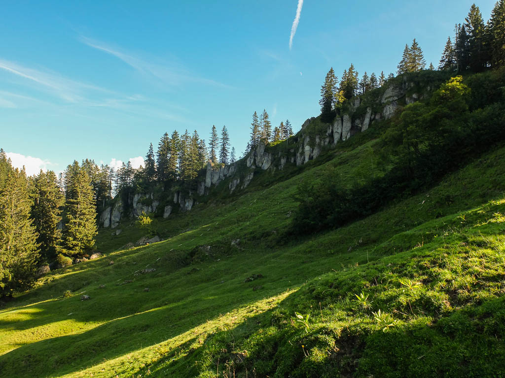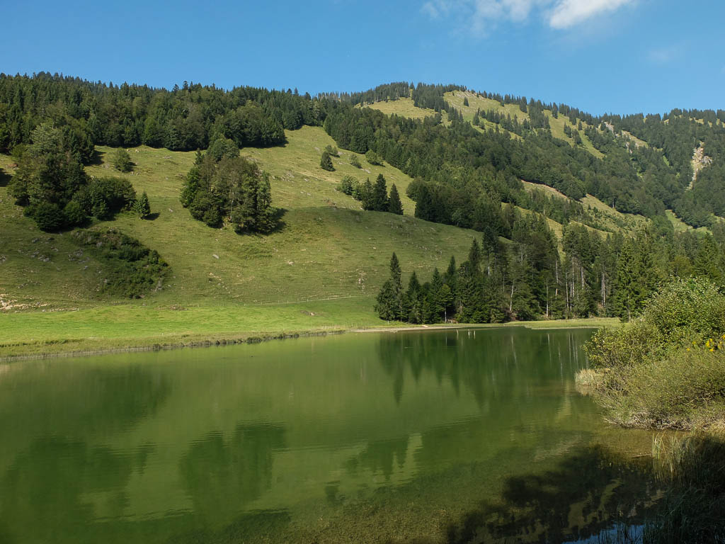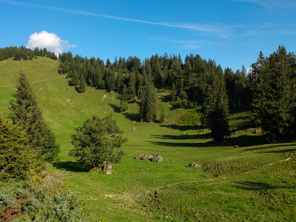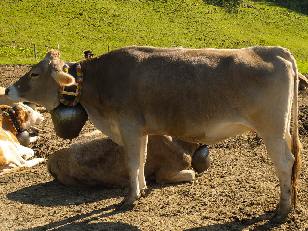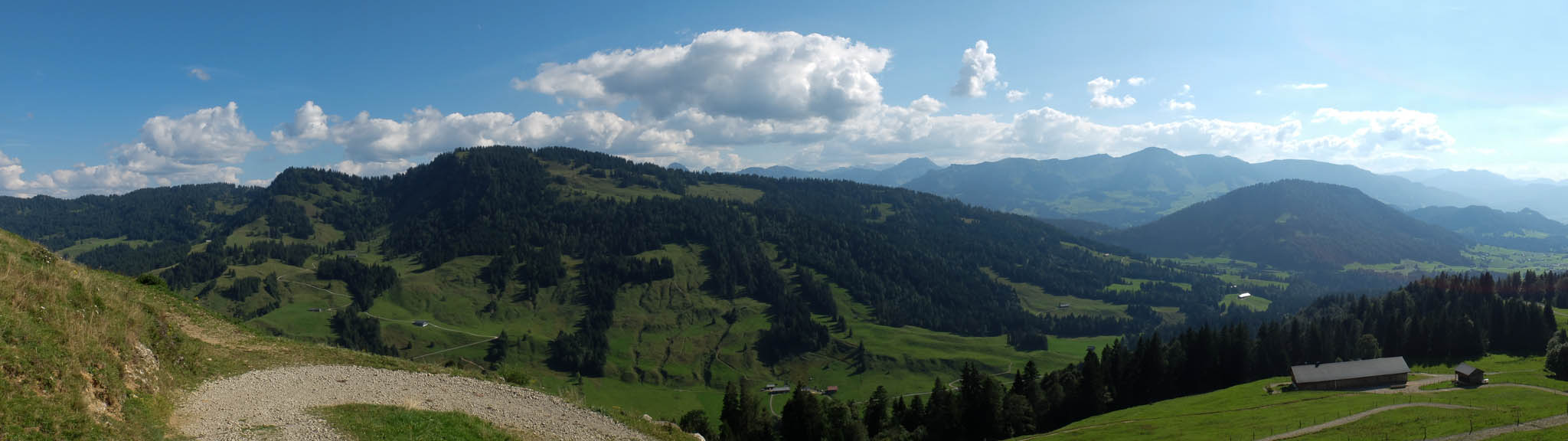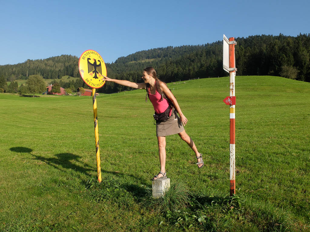 Unsere heutige Wanderung führte uns von der Bergstation der Imbergbahn über die Vordere Fluh-Alpe, die Hintere Fluh-Alpe, das Skigebiet „Hochlitten“ (Österreich), Hagspiel, den Dreiländerblick und Schindelberg zur Bushaltestelle in der Ortsmitte von Steibis. Die Streckenlänge betrug etwa 10 Kilometer (aufwärts 250 Meter, abwärts 600 Meter). Die Strecke war landschaftlich wunderschön, abgesehen von dem Abschnitt, der durch Österreich verlief. Den größten Teil konnte ich barfuß laufen. Das nächste Mal werden wir von der Vorderen Fluh-Alpe direkt nach Hagspiel gehen und uns damit den wenig erfreulichen Anblick von Hochlitten ersparen. Barfuß über die Weiden der Hinteren Fluh-Alpe: