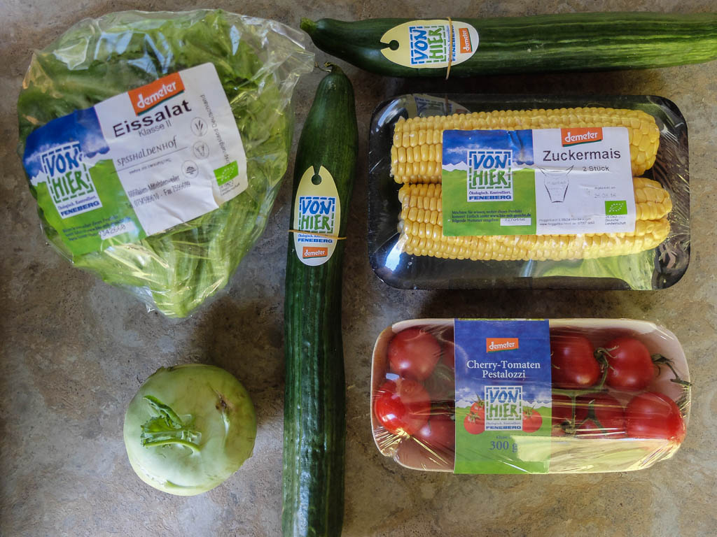 Auf dem Rückweg war es schon dunkel, aber ich war gerne allein im dunklen Wald unterwegs. Da fühlte ich mich geborgener als im Hellen in einem Stadtzentrum! Die letzte Mahlzeit fand von 21.10 bis 22.30 Uhr statt und bestand aus 750 Gramm Tomaten „Variationen“, 150 Gramm einer Salatgurke, 300 Gramm Eis(berg)salat und 370 Gramm Avocados „Fuerte“. Salat und Avocados zur späten Stunde, da sollte eine ruhige Nacht gewährleistet sein.