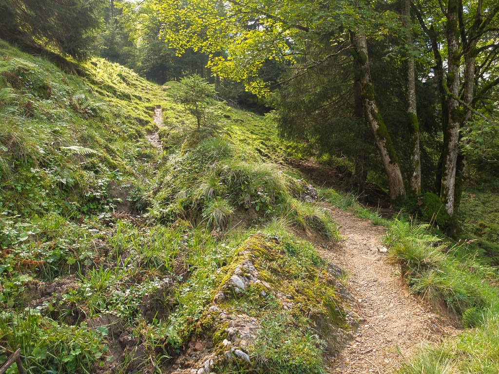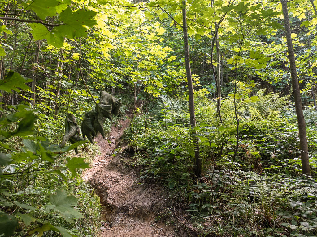 OpenStreetMap ist ein im Jahre 2004 gegründetes internationales Projekt mit dem Ziel, eine freie Weltkarte zu erschaffen. Immer wieder findet man dort Wege, die auf offiziellen Karten nicht eingezeichnet sind. Den oberen Teil von der Seele-Alpe hinauf zum Grat des Seelekopfs liefen wir in umgekehrter Richtung am 17. August schon einmal. Der Baumstamm, der damals quer über dem Weg lag, lag immer noch da. Zum Glück, denn er war an dieser steilen Stelle eigentlich sehr hilfreich. Der Pfad im unteren Teil: