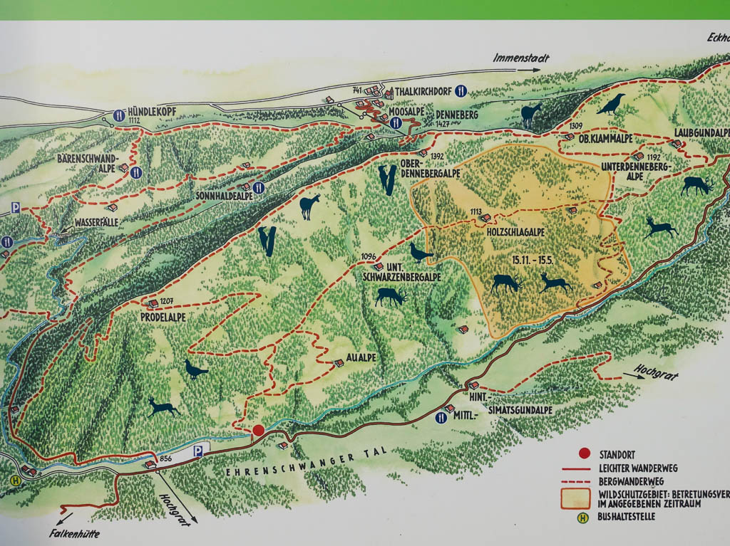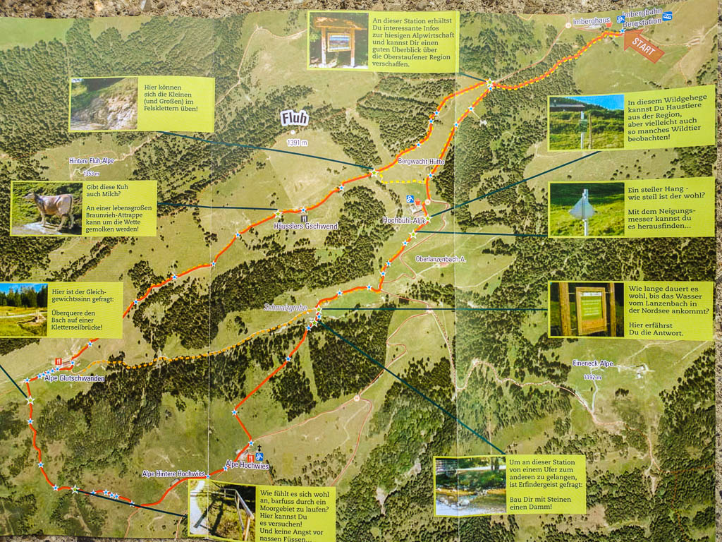 Um 19.00 Uhr kam ich zusammen mit Guido am Busbahnhof von Oberstaufen an. Die Fahrt begann um 18.50 Uhr in Steibis, dem Endpunkt unserer heutigen Wanderung. Sie führte von der Bergstation der Imbergbahn den Alperlebnispfad entlang: