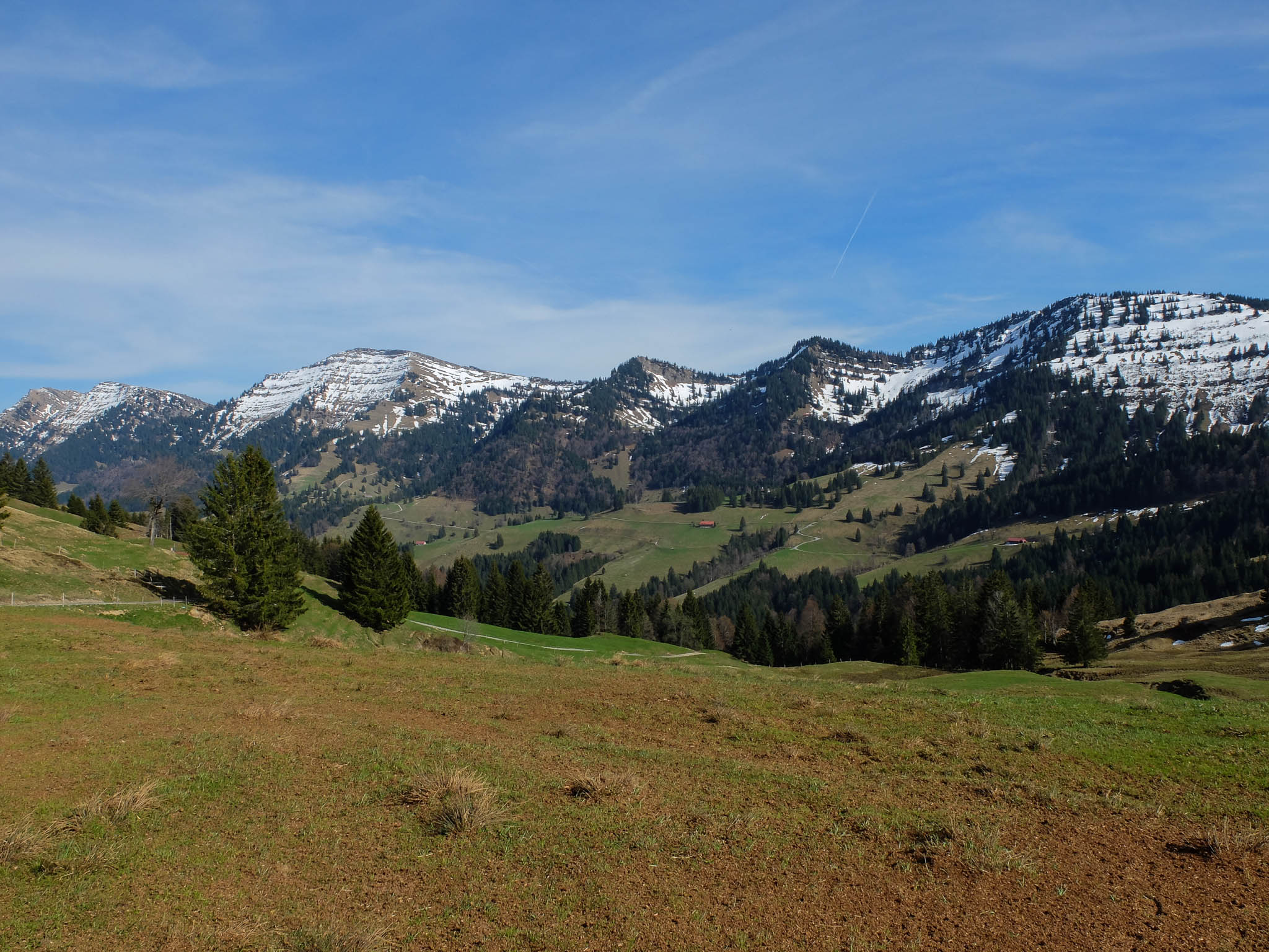 Wie man sah, war es hier noch ziemlich winterlich. Das Panorama auf das Ostrachtal während des Abstiegs, im Hintergrund war die Hörnergruppe und die Nagelfluhkette zu sehen: