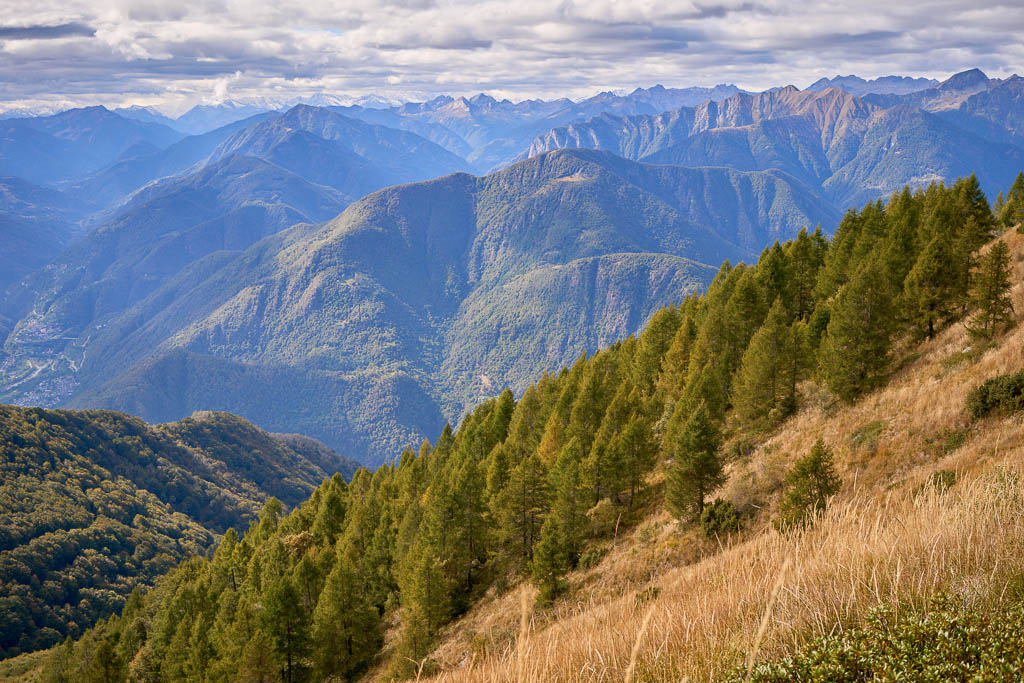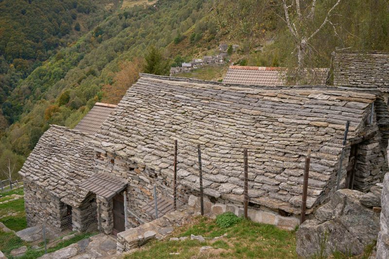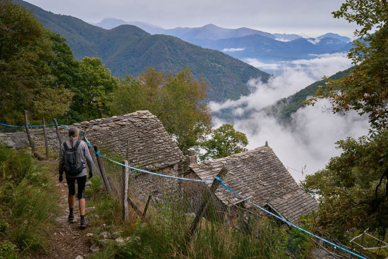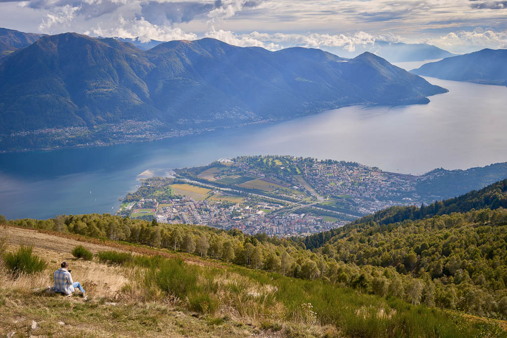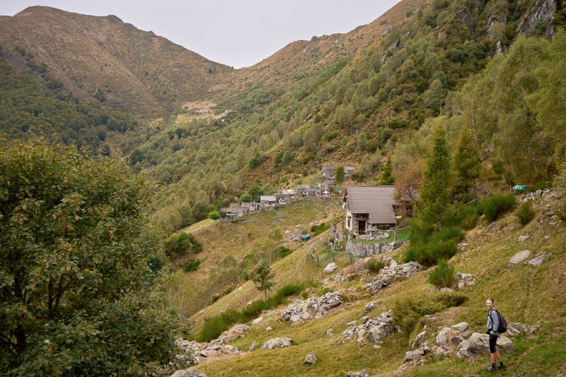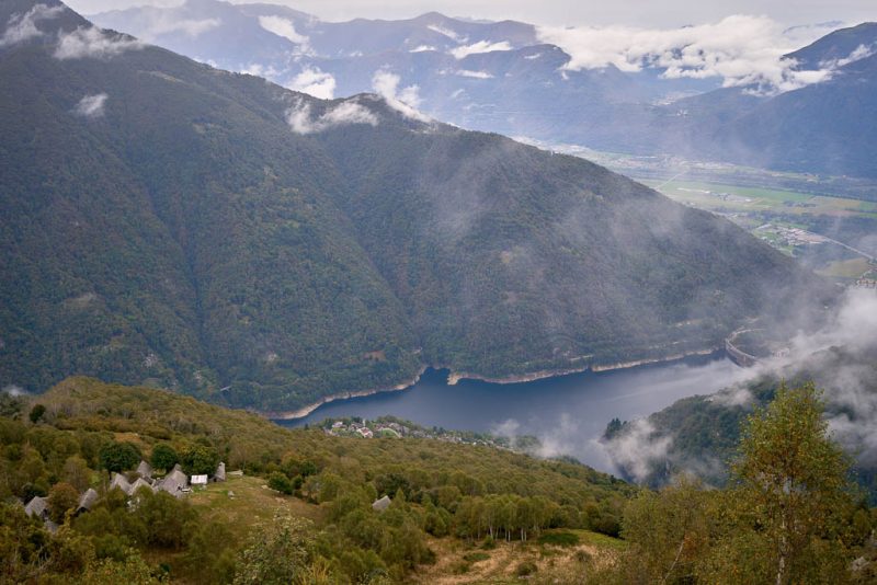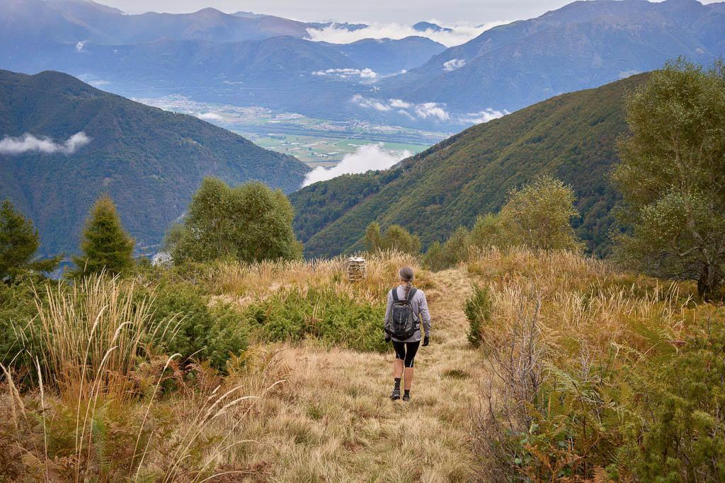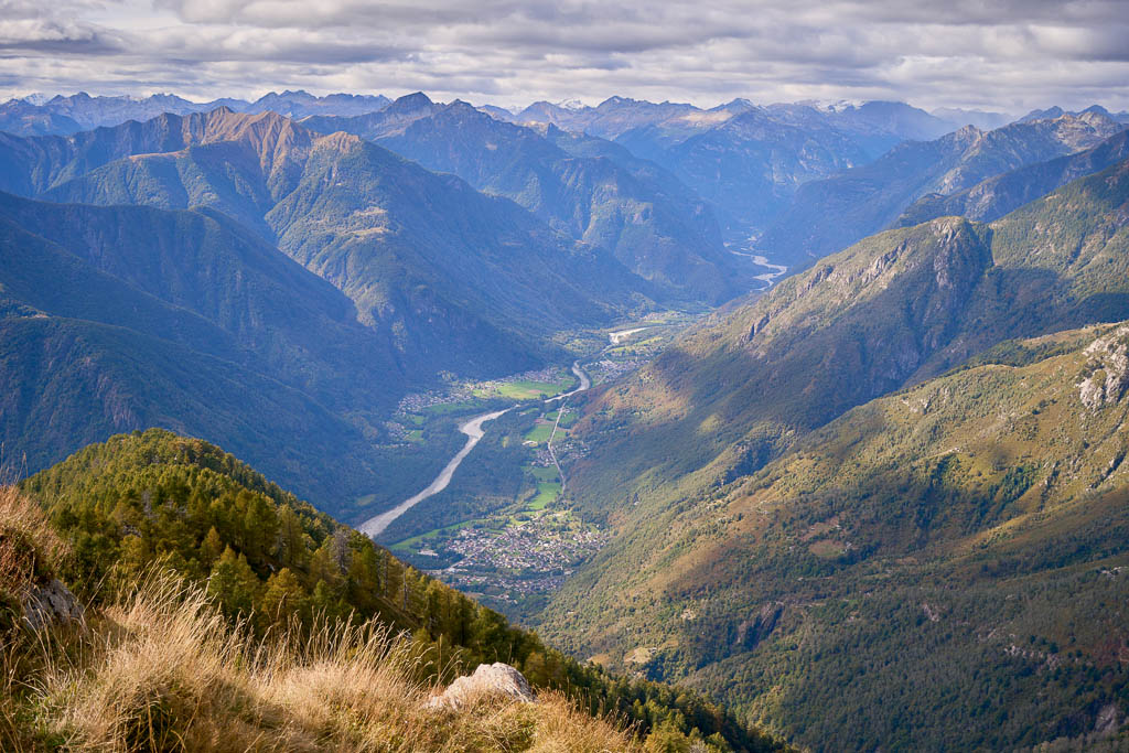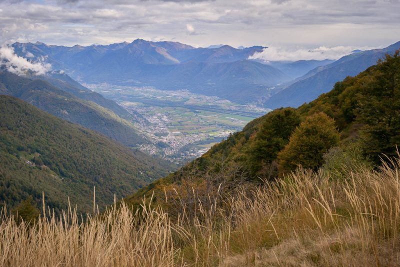 Ein Blick zurück auf die Hütten von Porchesio und Mergoscia, ganz unten im Tal sind die Ausläufer von Bellinzona zu sehen: