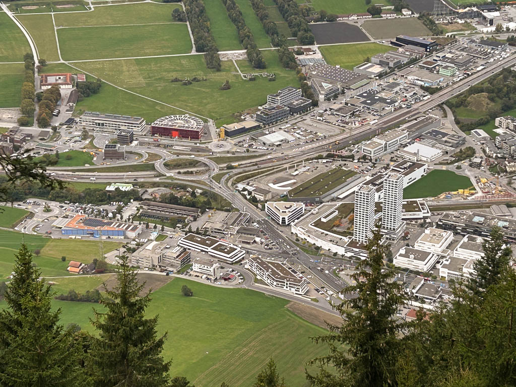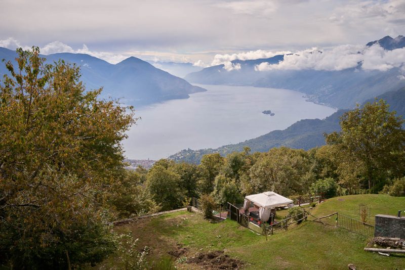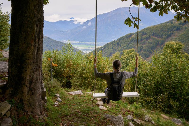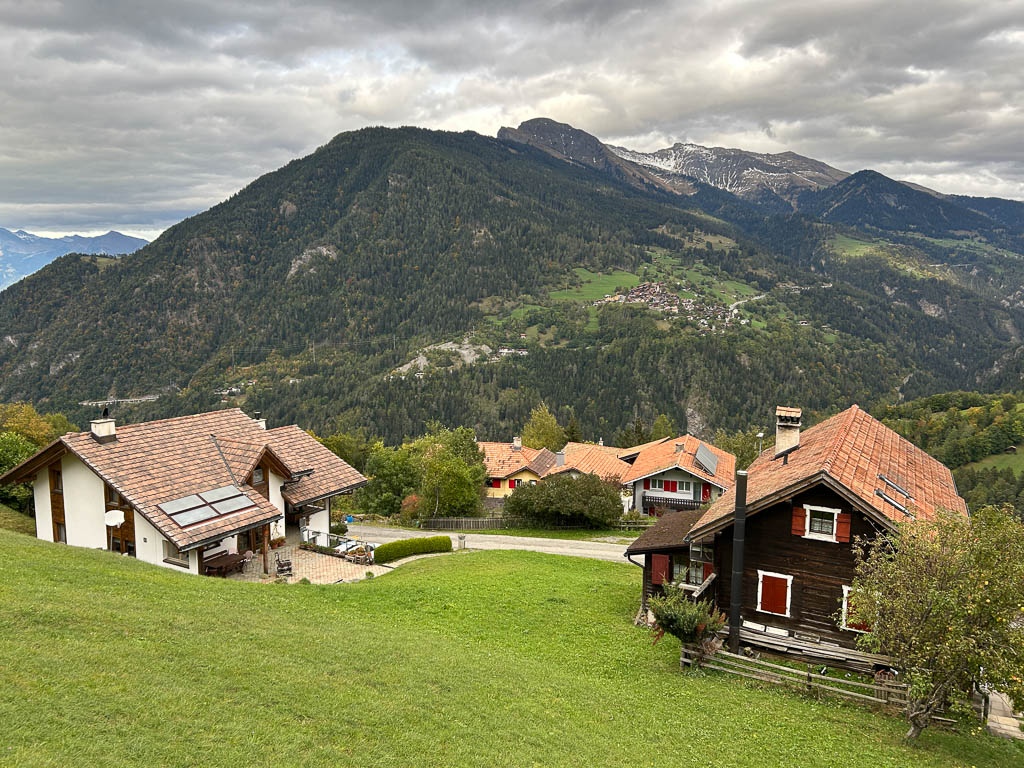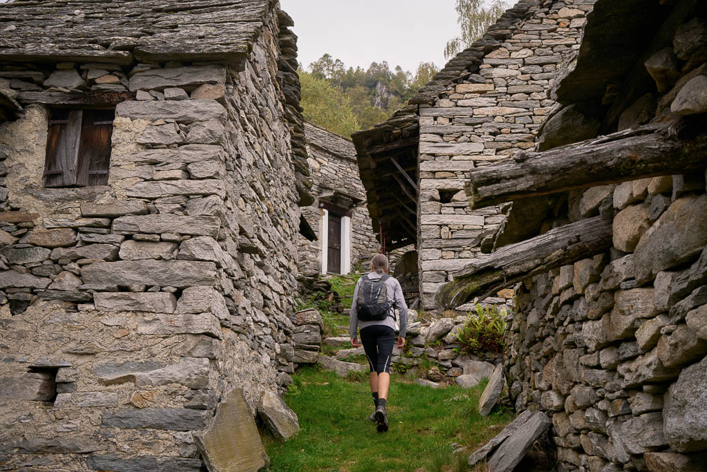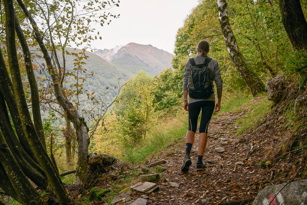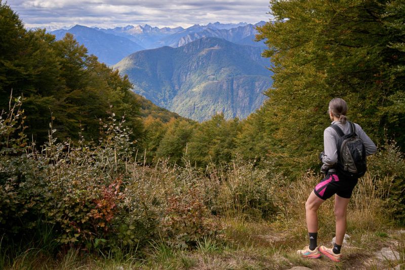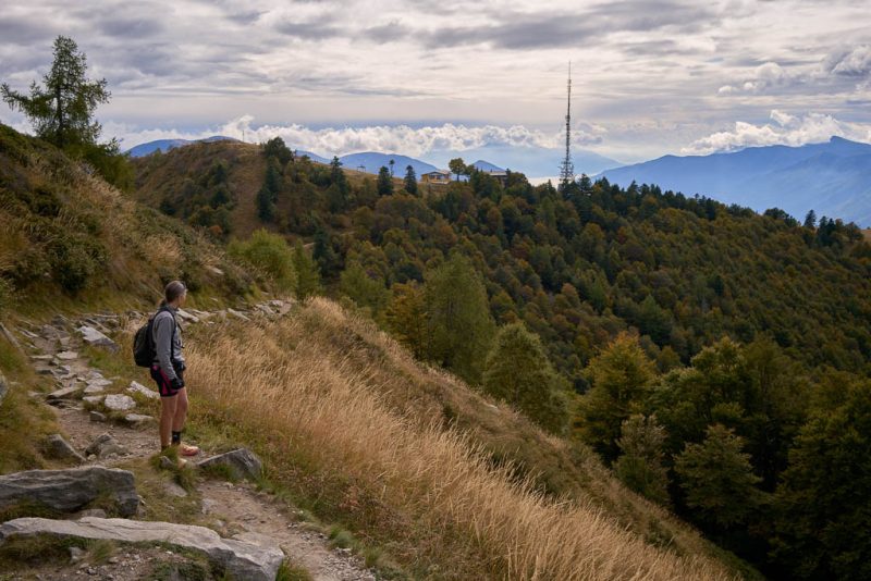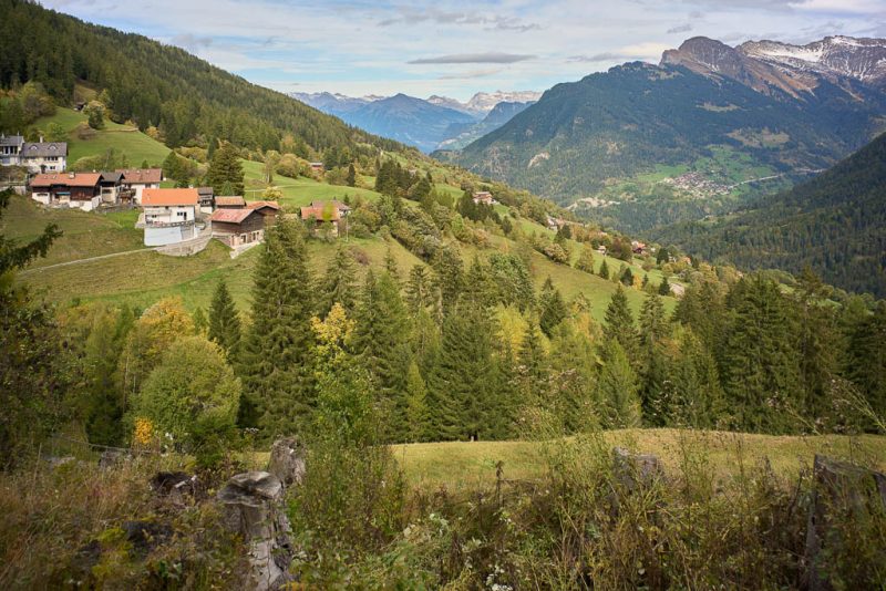 Ein Blick zurück auf die Hütten von Porchesio und Mergoscia, ganz unten im Tal sind die Ausläufer von Bellinzona zu sehen: