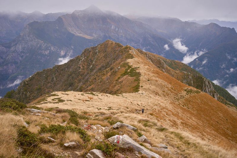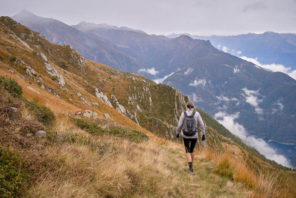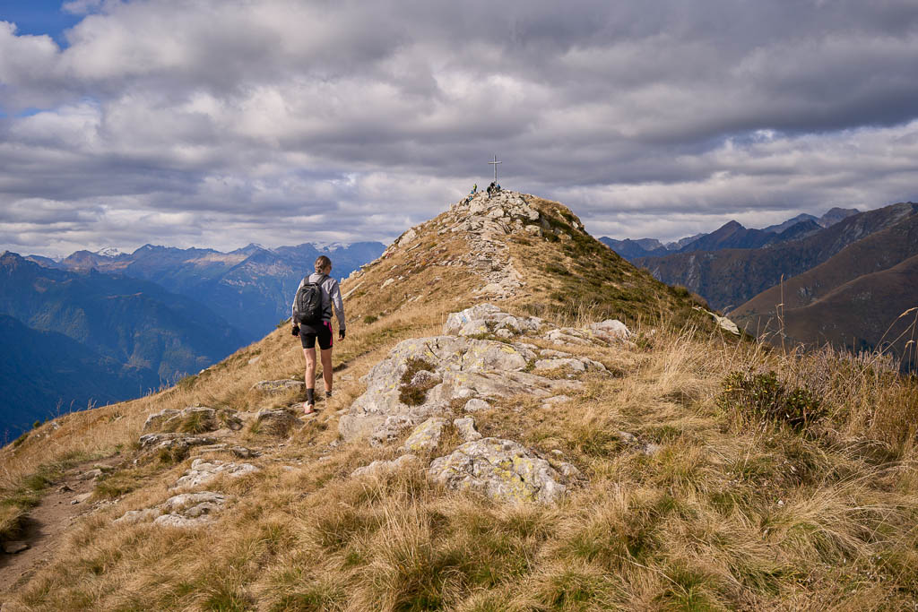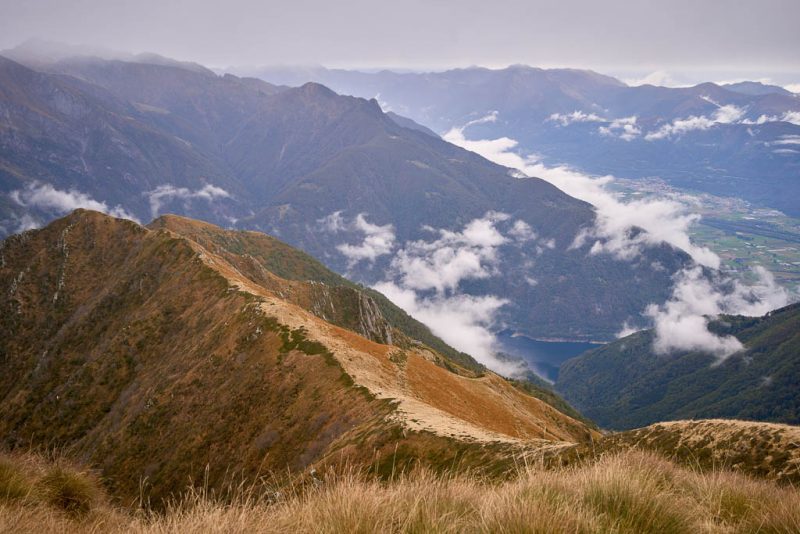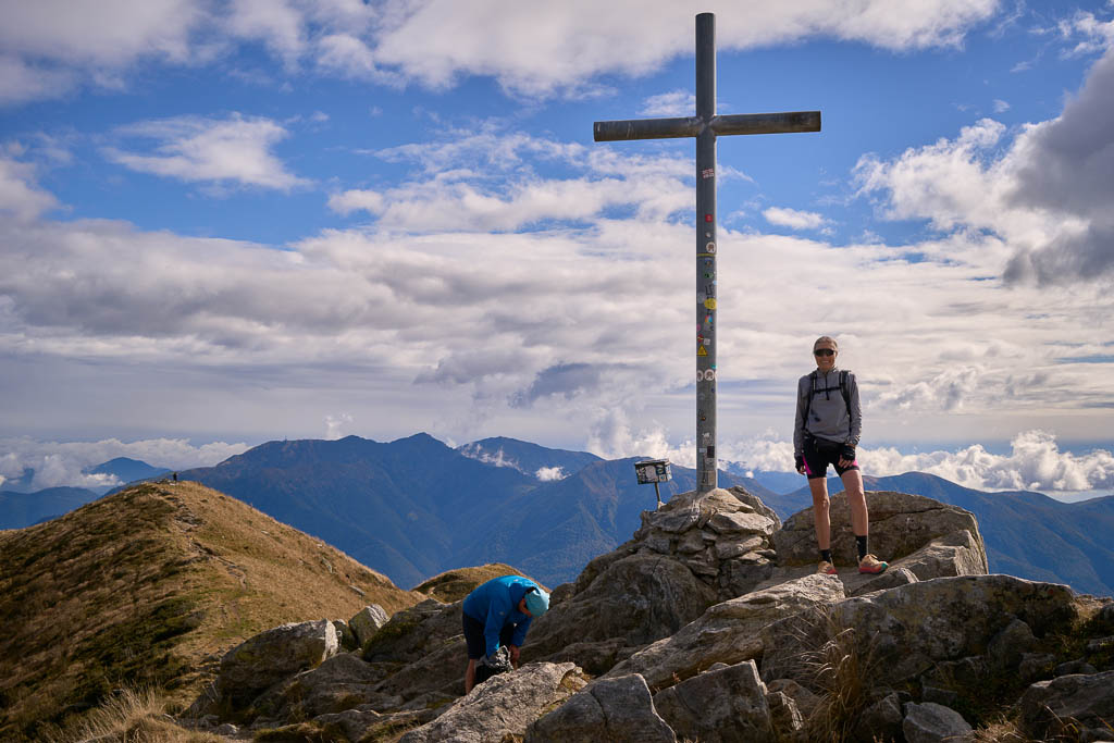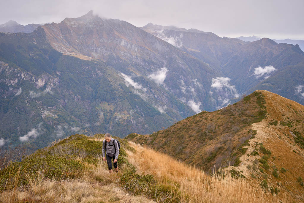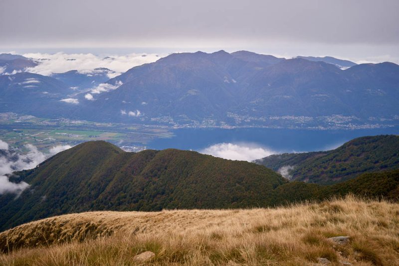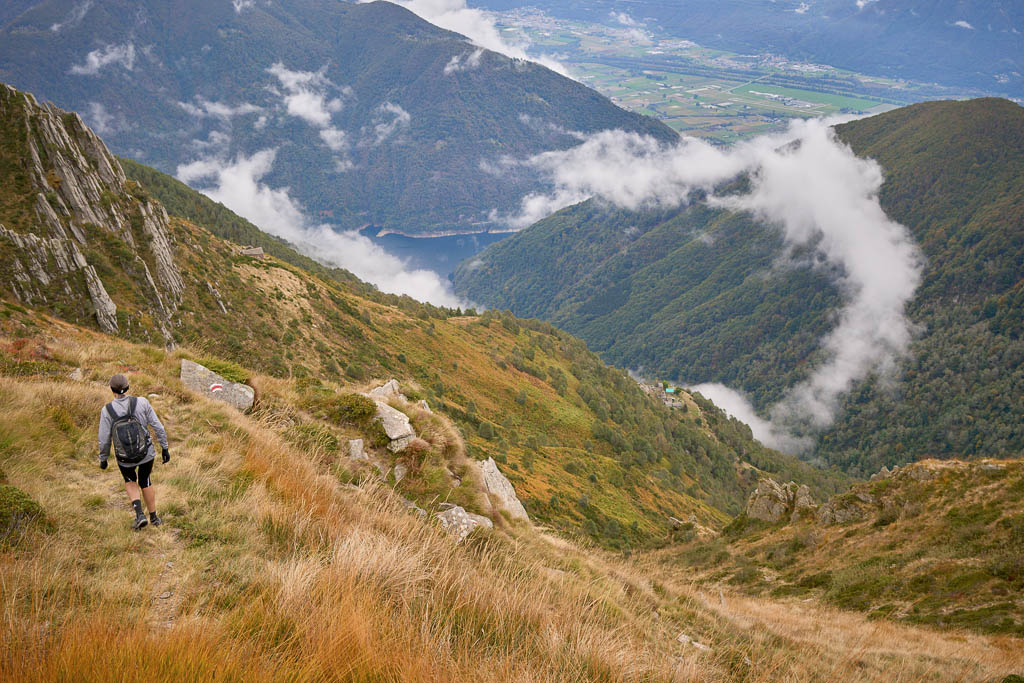 Zum Nordgipfel mit Gipfelkreuz und damit dem höchsten Punkt des Madones sind nochmals ein paar Höhenmeter zurückzulegen. Wir ersparen uns aber diese letzten Meter, da sich dichte Wolken aus dem Verzascatal nähern und hier oben zudem ein heftiger Wind bläst. Der Abstieg erfolgt nicht über den Aufstiegsweg, sondern auf der windgeschützten Südseite des Ostgrats, mal mit Blick auf den Lago di Vogorno, mal mit Blick auf den Lago Maggiore: