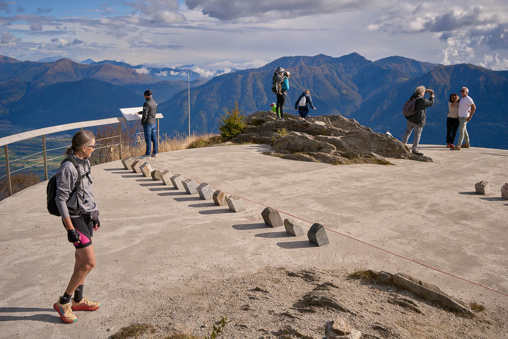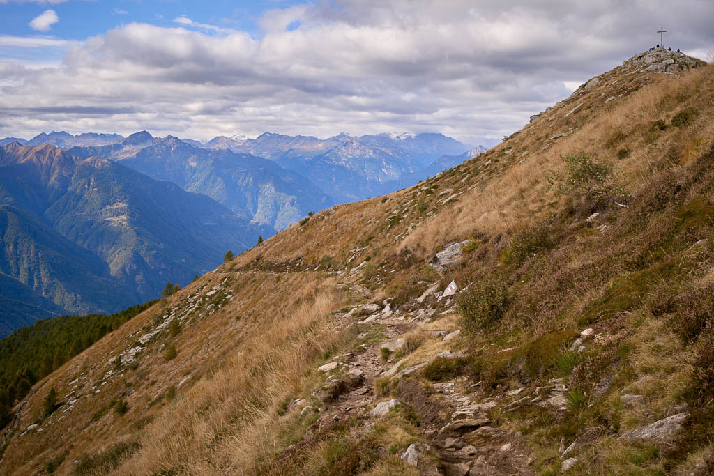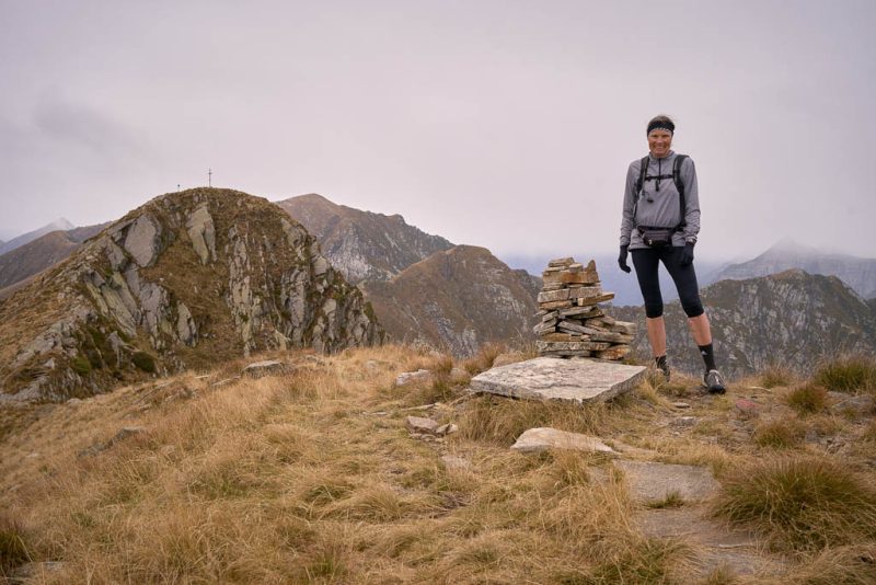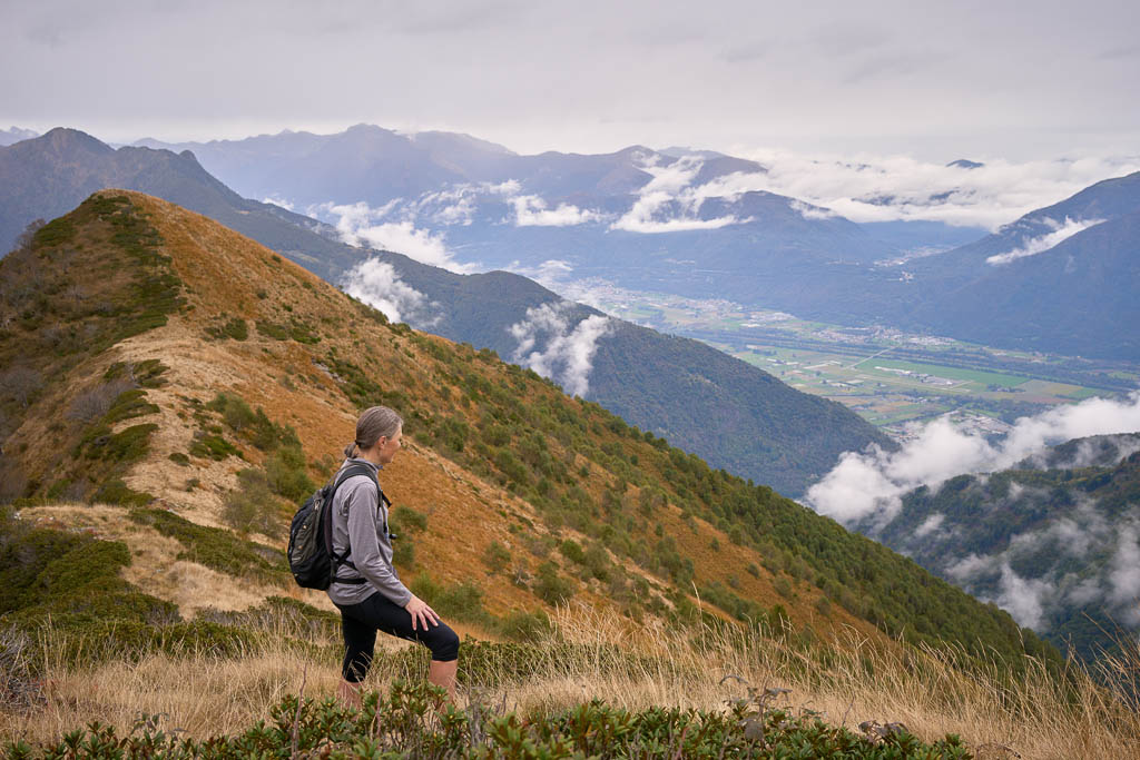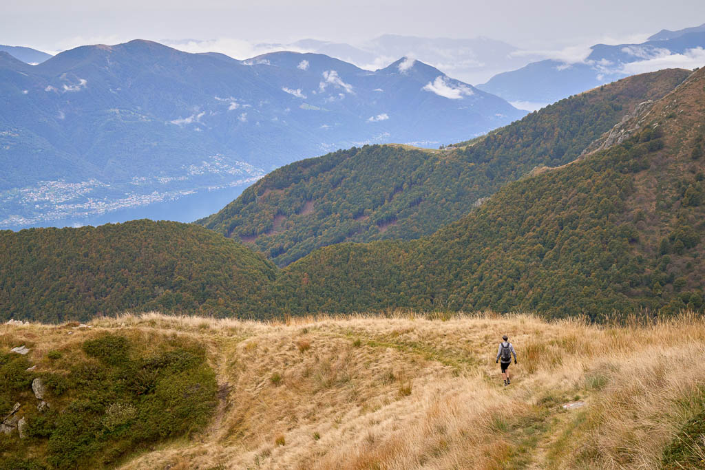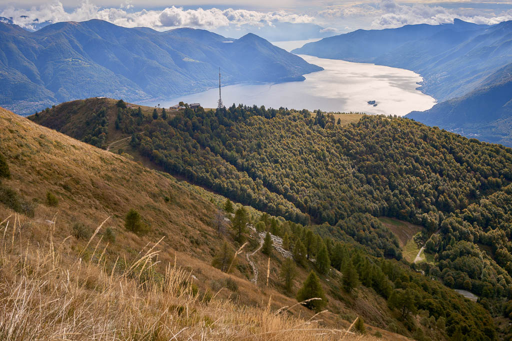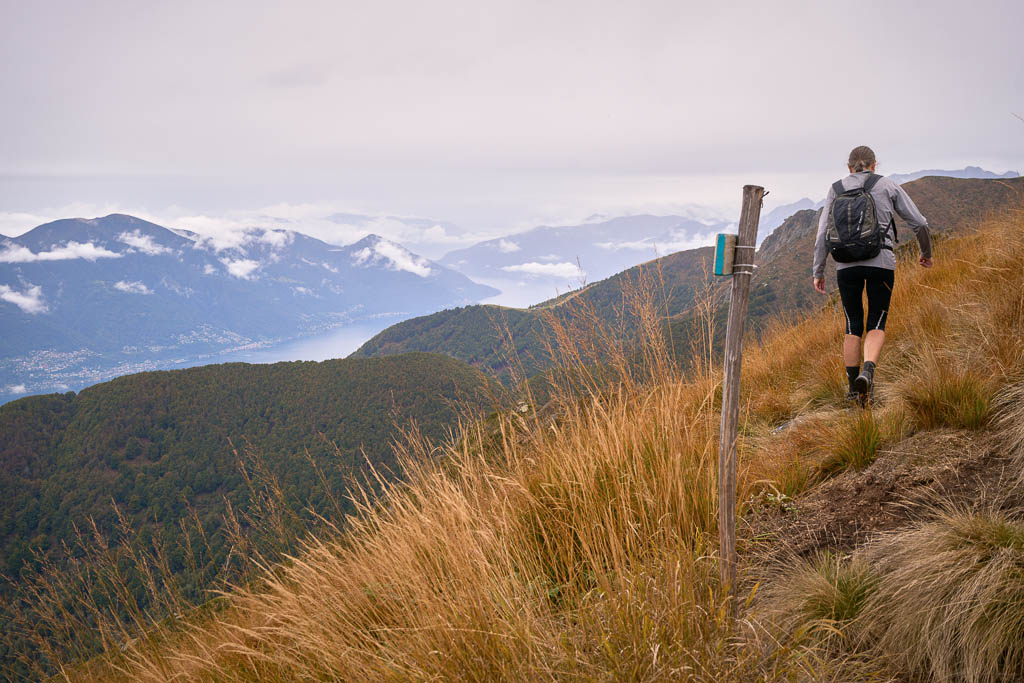 Zum Nordgipfel mit Gipfelkreuz und damit dem höchsten Punkt des Madones sind nochmals ein paar Höhenmeter zurückzulegen. Wir ersparen uns aber diese letzten Meter, da sich dichte Wolken aus dem Verzascatal nähern und hier oben zudem ein heftiger Wind bläst. Der Abstieg erfolgt nicht über den Aufstiegsweg, sondern auf der windgeschützten Südseite des Ostgrats, mal mit Blick auf den Lago di Vogorno, mal mit Blick auf den Lago Maggiore: