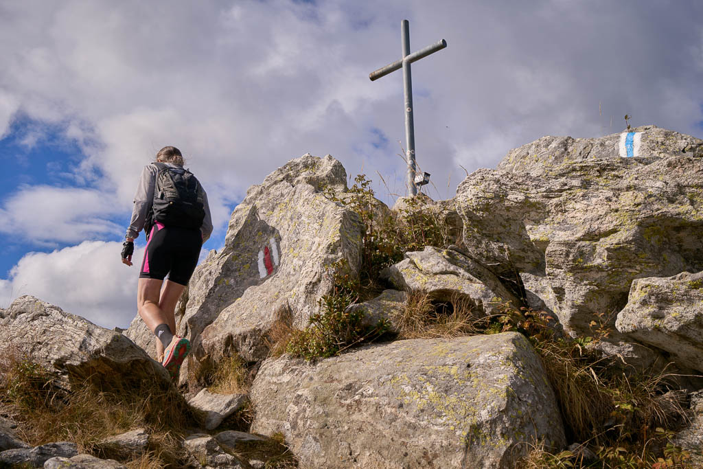 Schließlich erreichen wir einen Sattel mit einem Wegweiser. Von hier aus sind es nur noch wenige Meter bis zum Südgipfel, den ein Steinmann schmückt:
