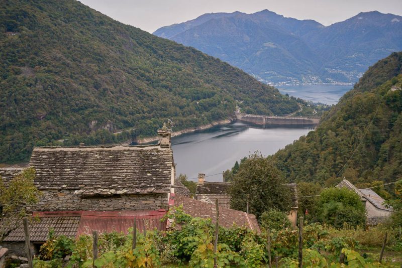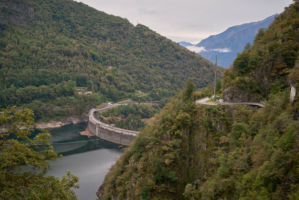Nach zwei Radtouren wollen wir heute wandern und zum Madone aufsteigen. Der Madone ist ein 2051 Meter hoher Gipfel, der zwischen den Tälern von Maggia und Verzasca liegt. Um den Gipfel zu erreichen, sind von unserer Ferienwohnung aus über 13 Kilometer und 1700 Höhenmeter im Aufstieg zu überwinden. Um uns den Aufstieg und später den Abstieg zu erleichtern, legen wir die ersten sieben Kilometer und 400 Höhenmeter mit den Rädern zurück und fahren von Contra di Sotta hinauf nach Mergoscia. Wir fahren heute also an der Abzweigung, die zur Staumauer führt, vorbei und radeln weiter bergauf. Ein Blick von der Straße auf die Staumauer:
