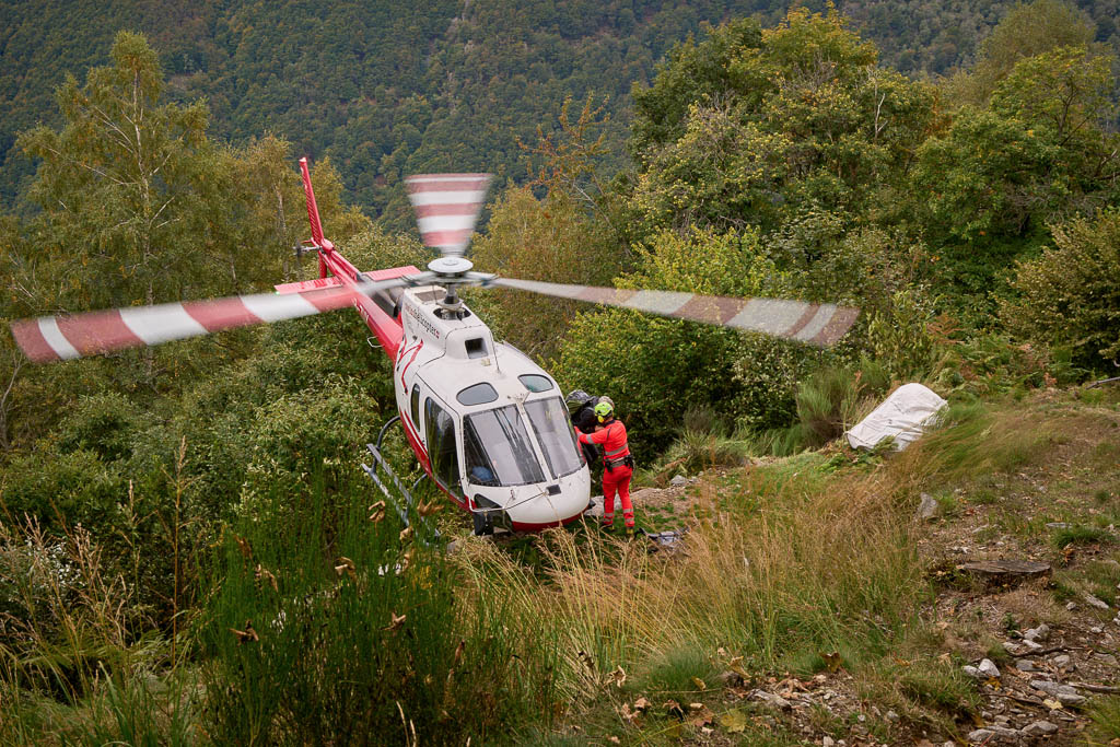 Gleich neben der Hütte liegt ein zusammengeschnürtes Bündel. Ich vermute, dass dieses Bündel irgendwann mit einem Helikopter Richtung Tal befördert wird. Ich habe diese Vermutung kaum ausgesprochen, als wie auf Kommando das Knattern eines Helikopters ertönt. Ich flüchte schnell unter die Bäume, einen Wimpernschlag später schwebt der Helikopter auch schon heran und entlässt Gäste:
