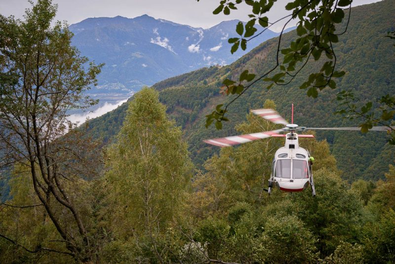 Was für ein Zufall, dass wir gerade in diesem Moment an der Hütte stehen und dem Manövrieren des Helikopters zuschauen können! Ganz einfach ist das nicht, denn er kann nicht landen, sondern nur die Kufen am Rande einer Stützmauer absetzen. Nach dem Abladen der Gäste verschwindet der Helikopter wieder mit lautem Getöse Richtung Tal: