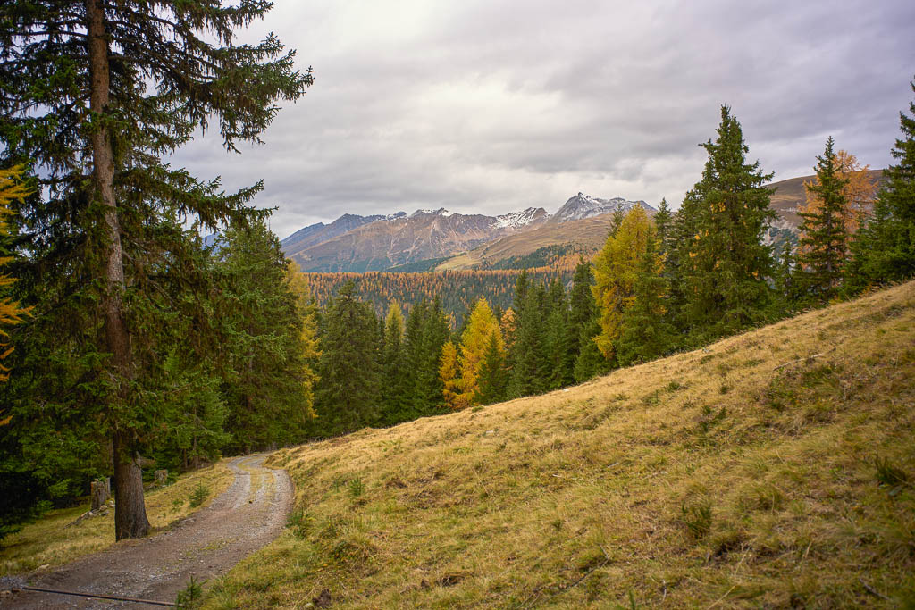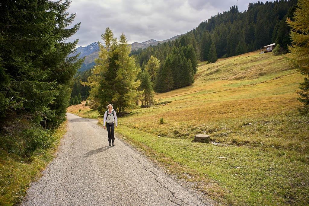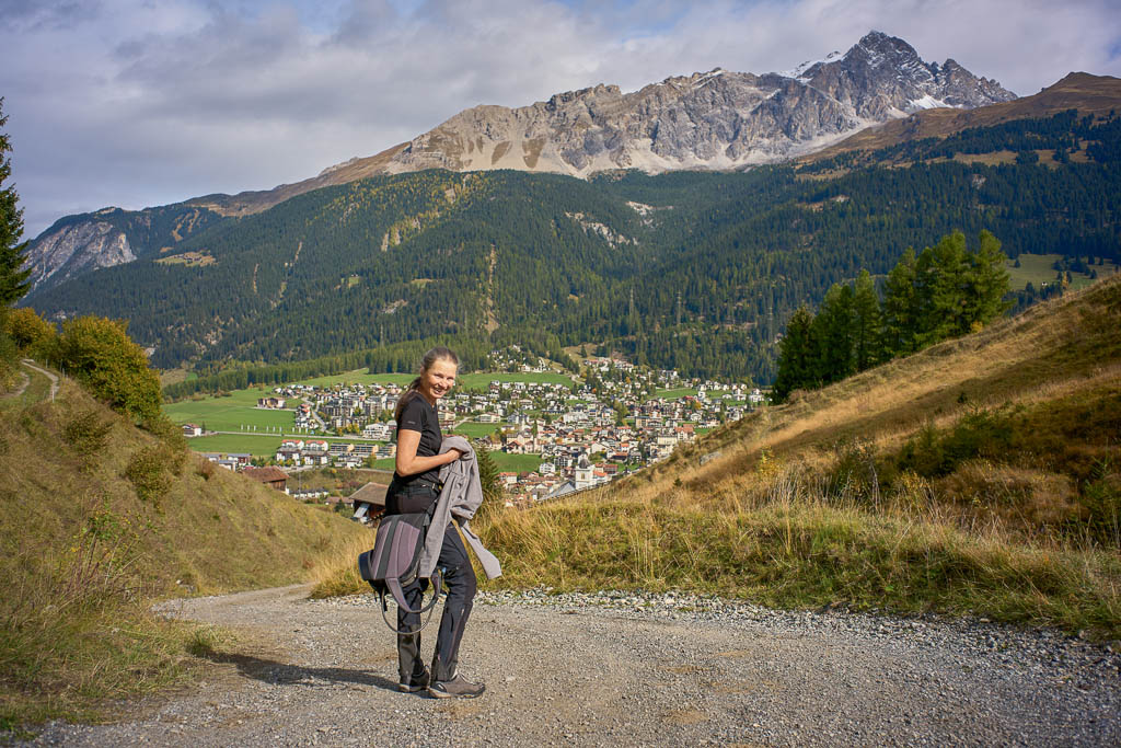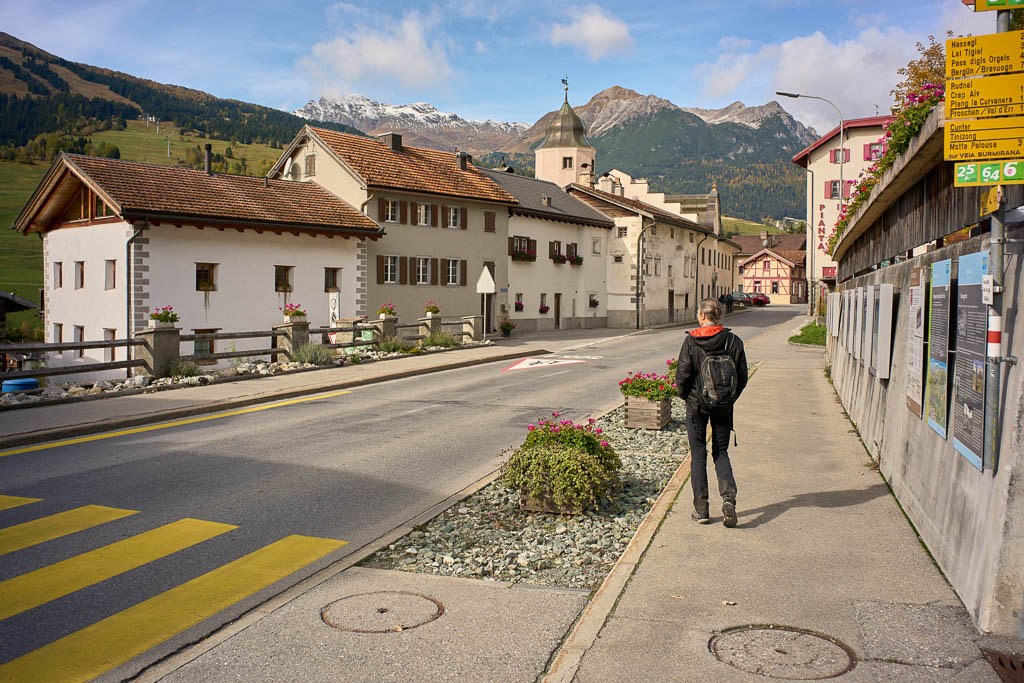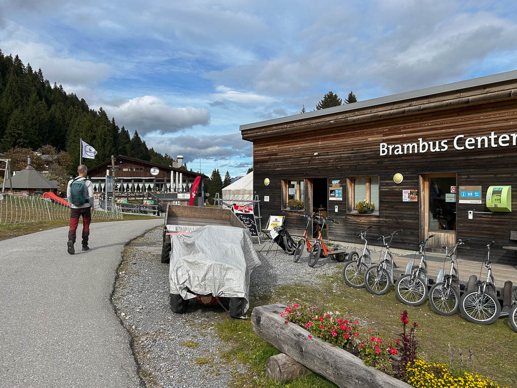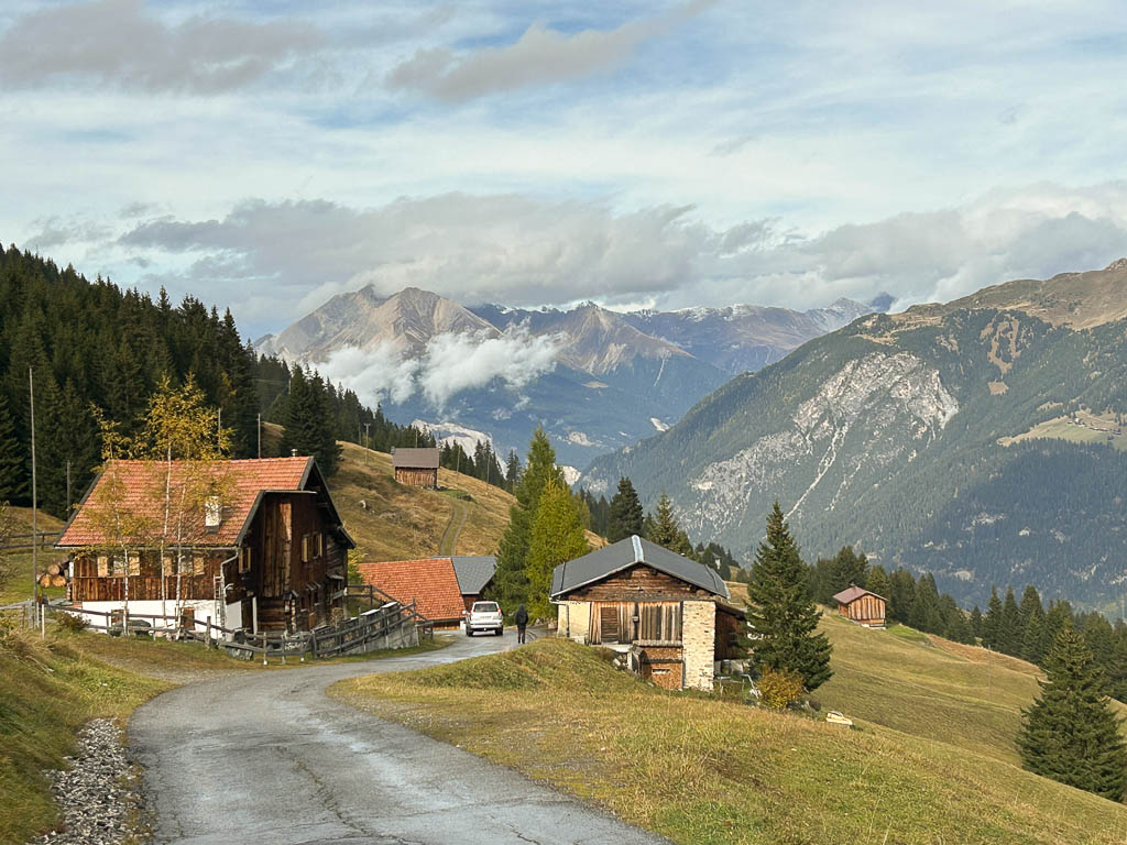 Bei Mòtt endet die Straße und wir stellen unsere Räder am Rande eines Parkplatzes ab. Wanderwegweiser zeigen uns ab hier den Weg hinauf zum Madone: