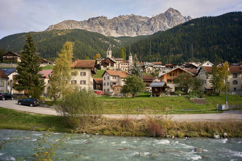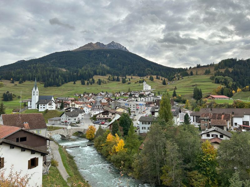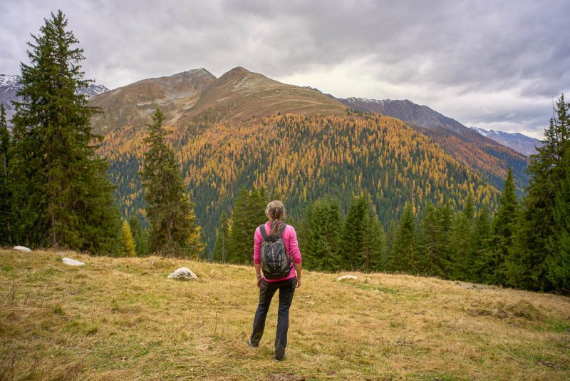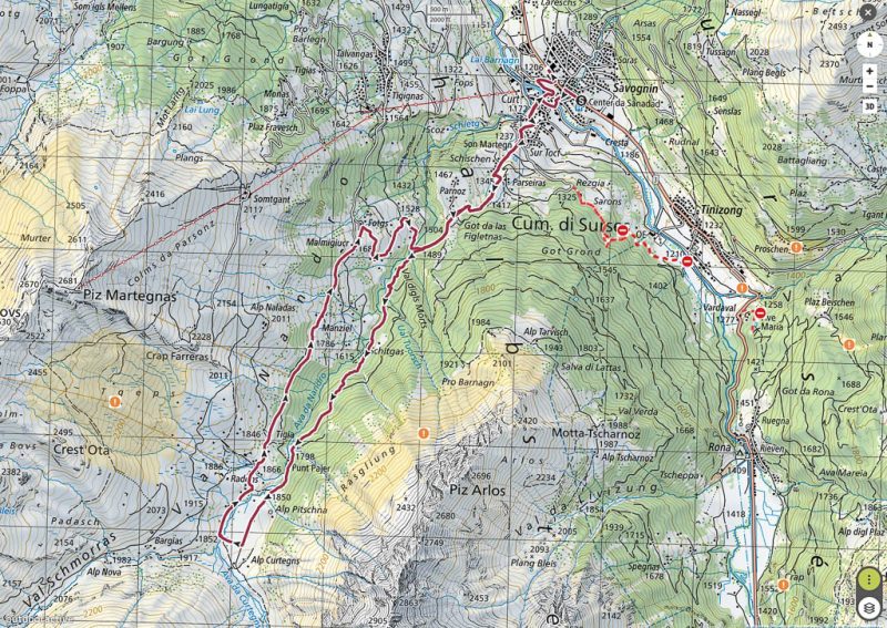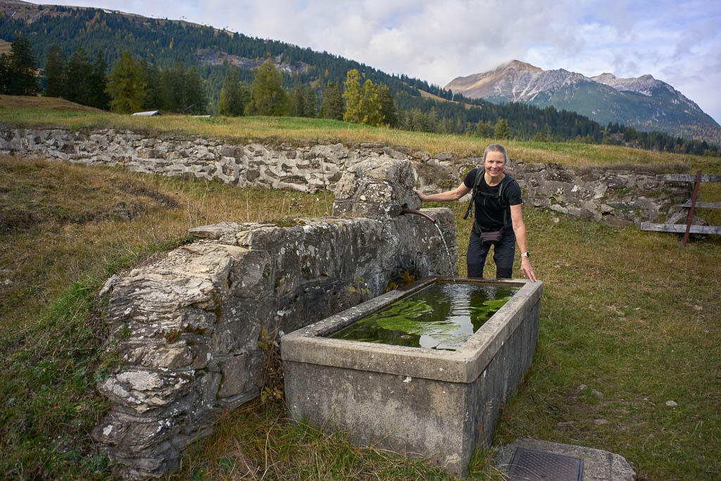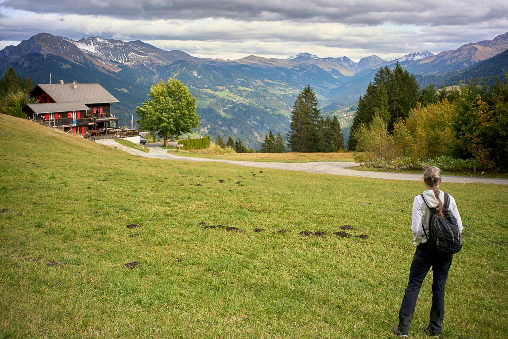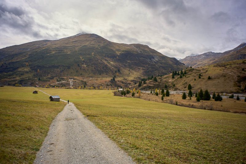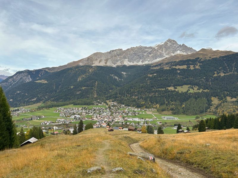 Bei Mòtt endet die Straße und wir stellen unsere Räder am Rande eines Parkplatzes ab. Wanderwegweiser zeigen uns ab hier den Weg hinauf zum Madone: