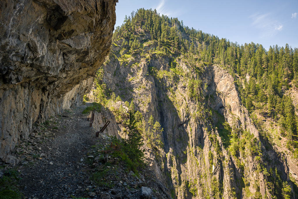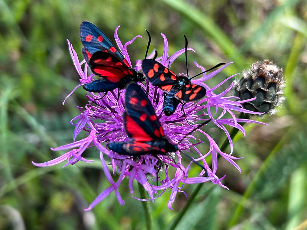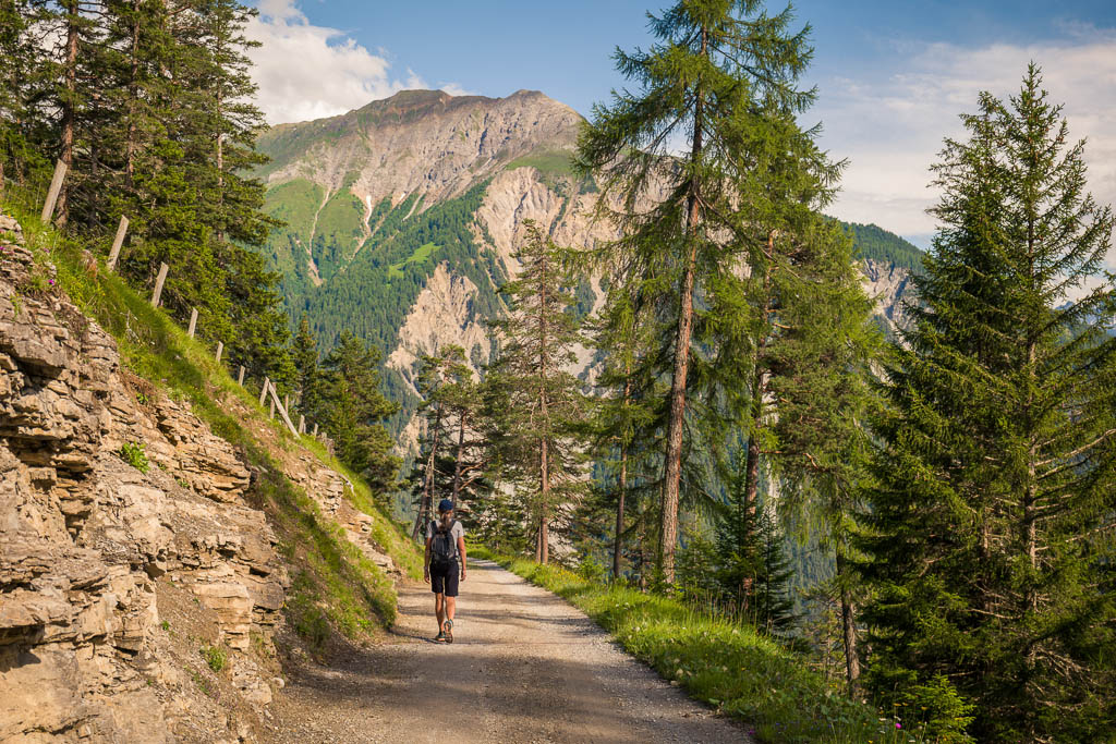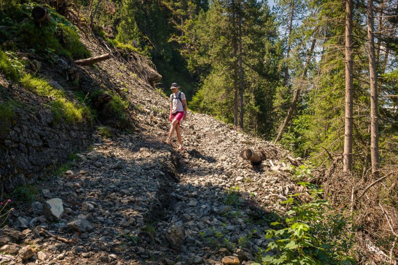 Am Ende des Tals geht es deutlich steiler als bisher über die Hänge von Bodmen weiter. Hier kommen uns etliche Mountainbiker teils fahrend, teils schiebend entgegen. Ich hätte an einer Abfahrt über das steile, verblockte Gelände mit Sicherheit keine Freude.