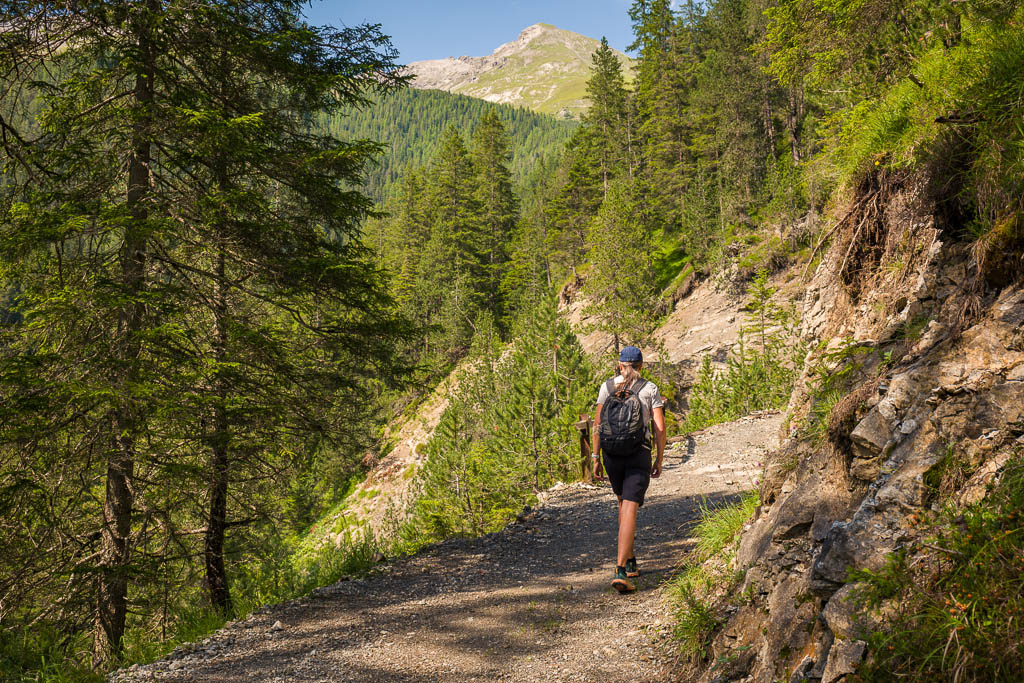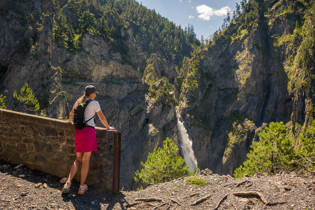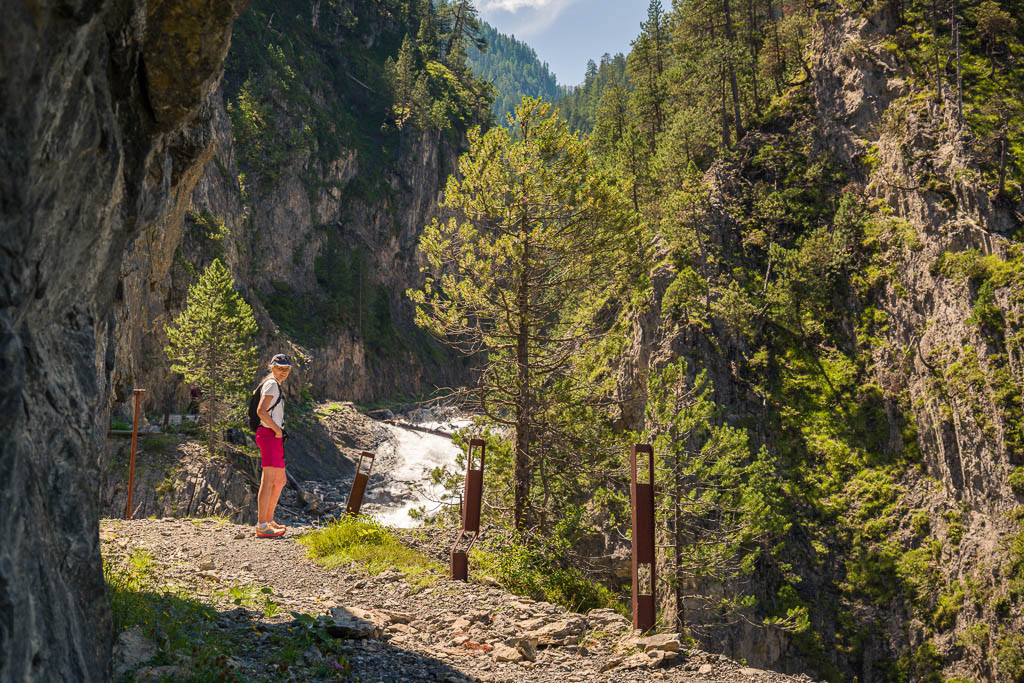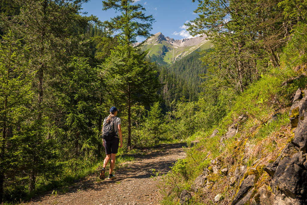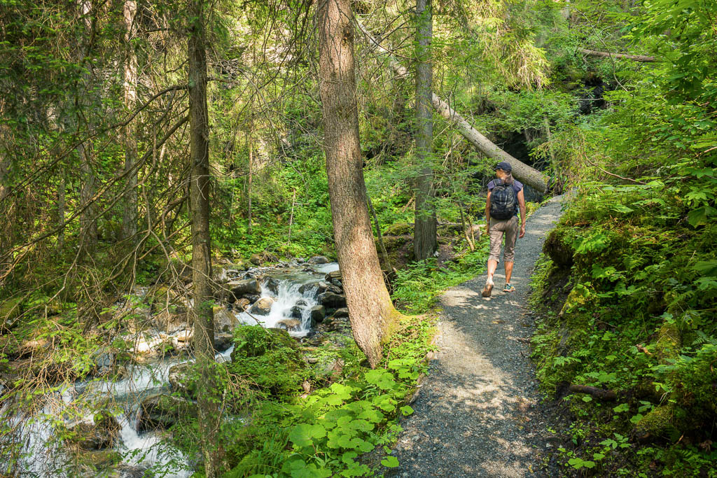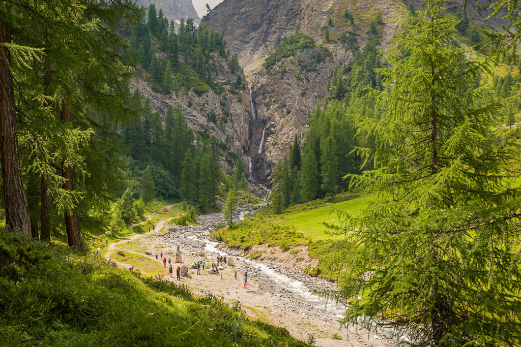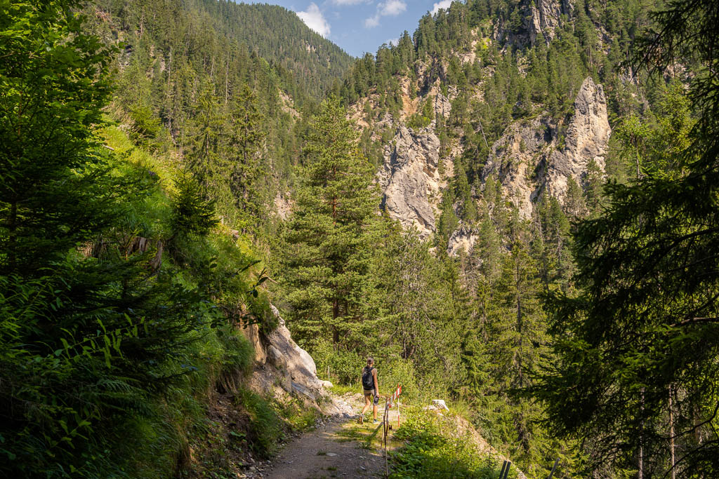 Hier sind wie meist an Sonntagen bzw. schönem Wetter zahlreiche Urlauber unterwegs. Das ändert sich, sobald wir diesen Weg verlassen und dem über Mittelchrüz führenden Weg hinauf ins Ducantal folgen. Ein Blick Richtung Wasserfall zeigt, wohin es die meisten Leute zieht: