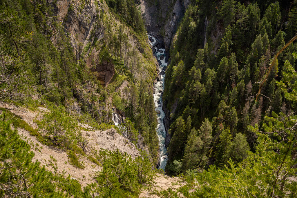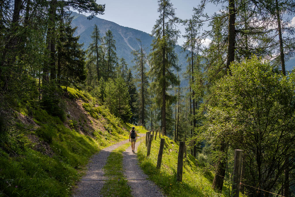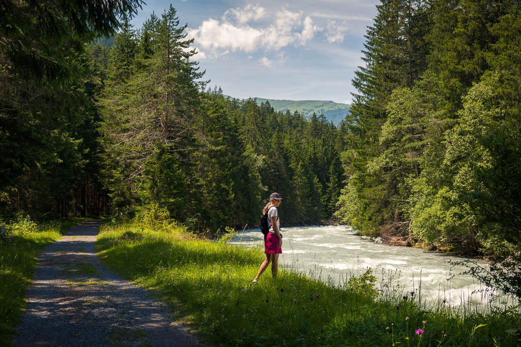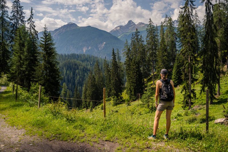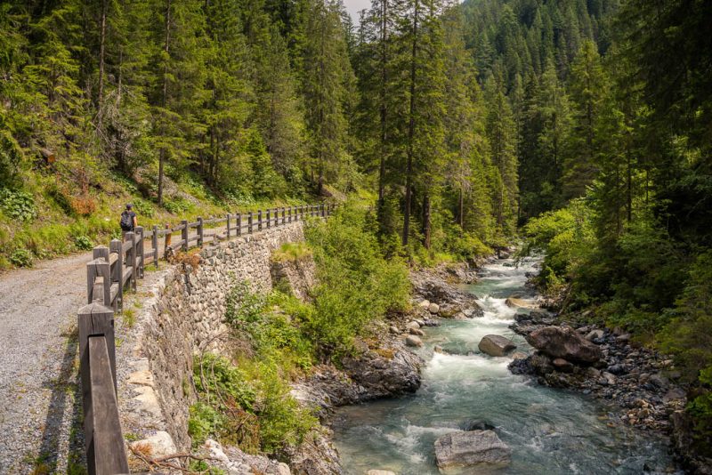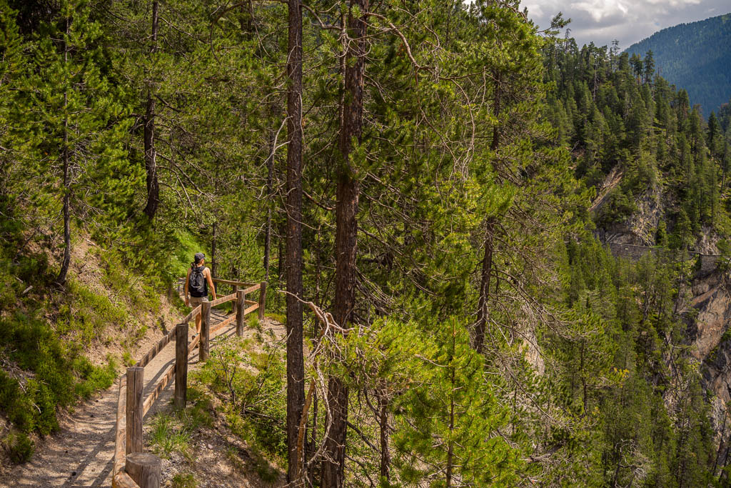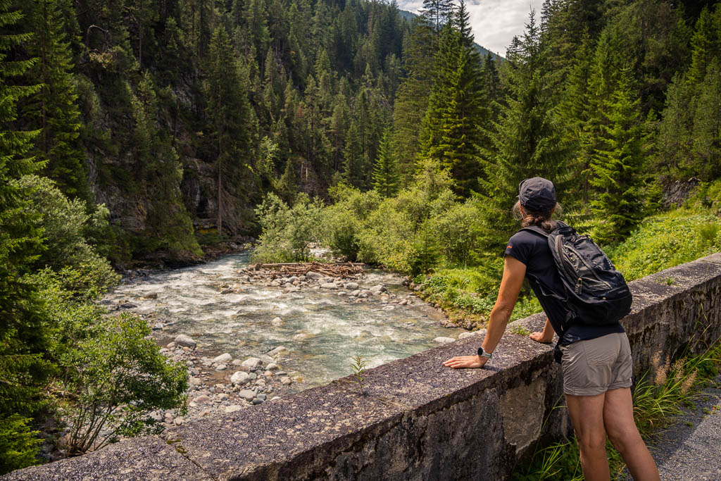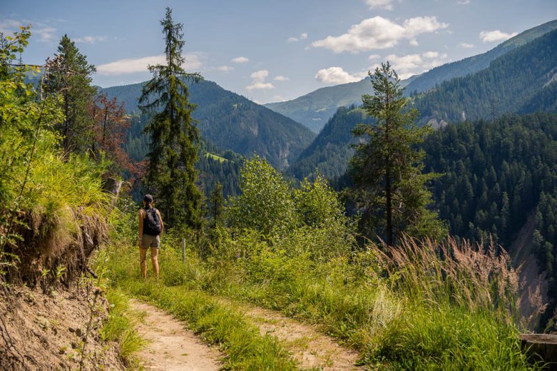 Hier sind wie meist an Sonntagen bzw. schönem Wetter zahlreiche Urlauber unterwegs. Das ändert sich, sobald wir diesen Weg verlassen und dem über Mittelchrüz führenden Weg hinauf ins Ducantal folgen. Ein Blick Richtung Wasserfall zeigt, wohin es die meisten Leute zieht: