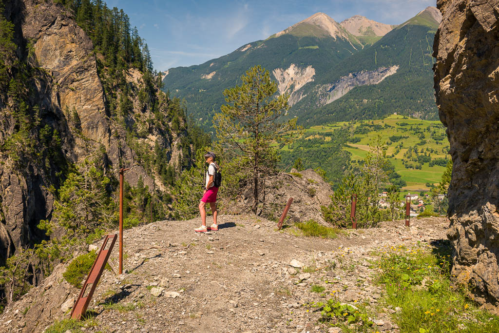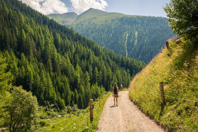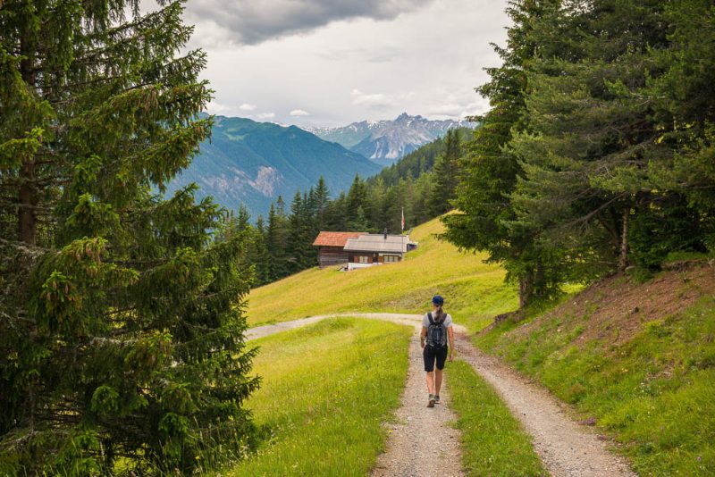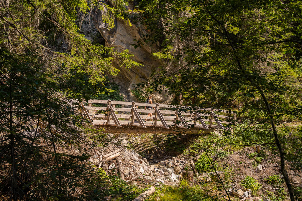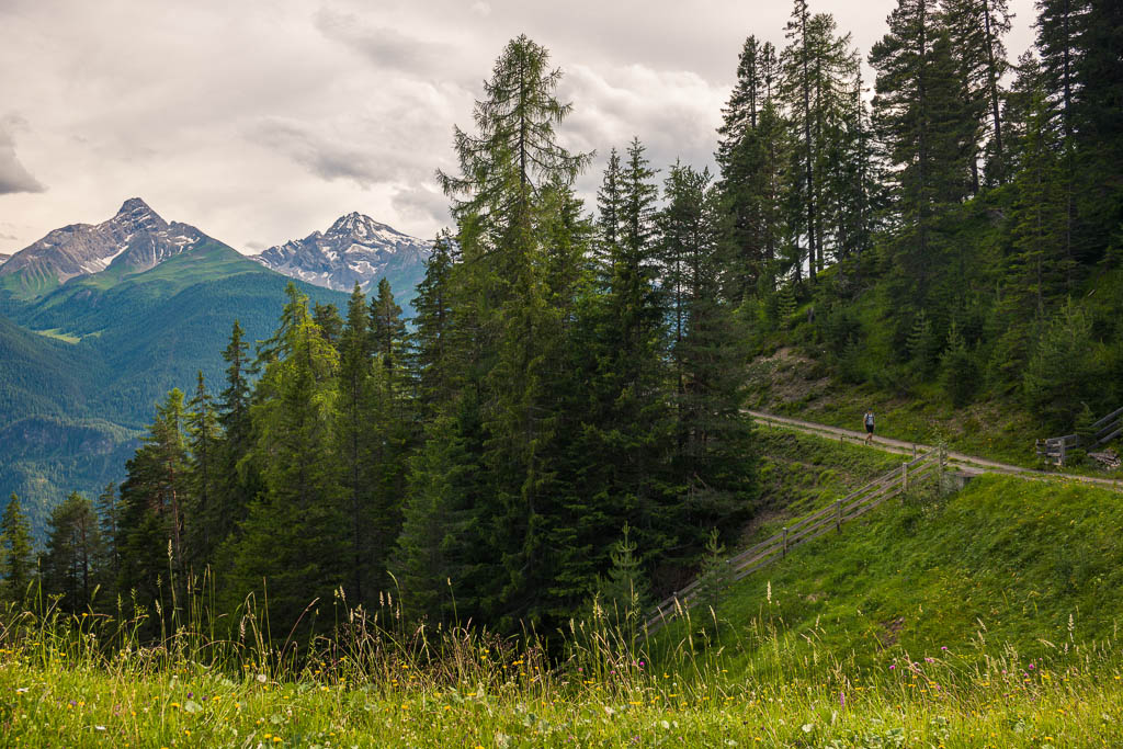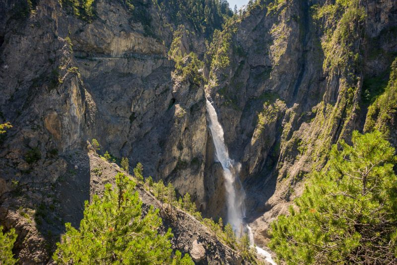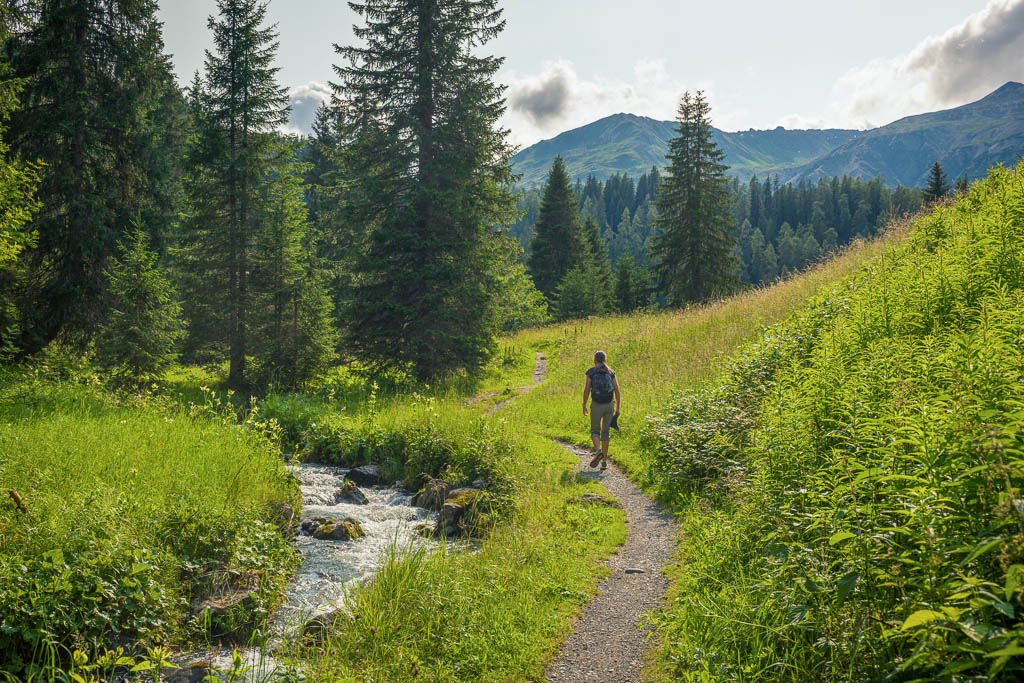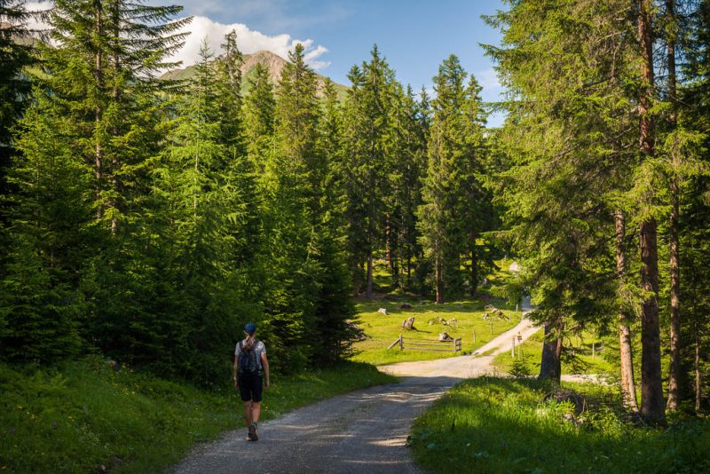 Hier sind wie meist an Sonntagen bzw. schönem Wetter zahlreiche Urlauber unterwegs. Das ändert sich, sobald wir diesen Weg verlassen und dem über Mittelchrüz führenden Weg hinauf ins Ducantal folgen. Ein Blick Richtung Wasserfall zeigt, wohin es die meisten Leute zieht: