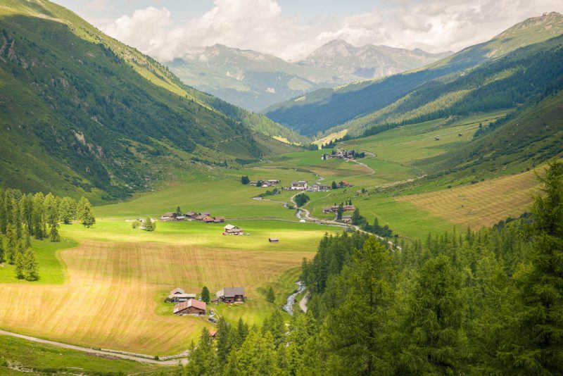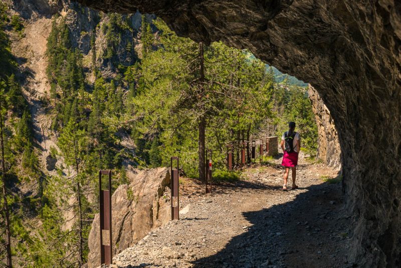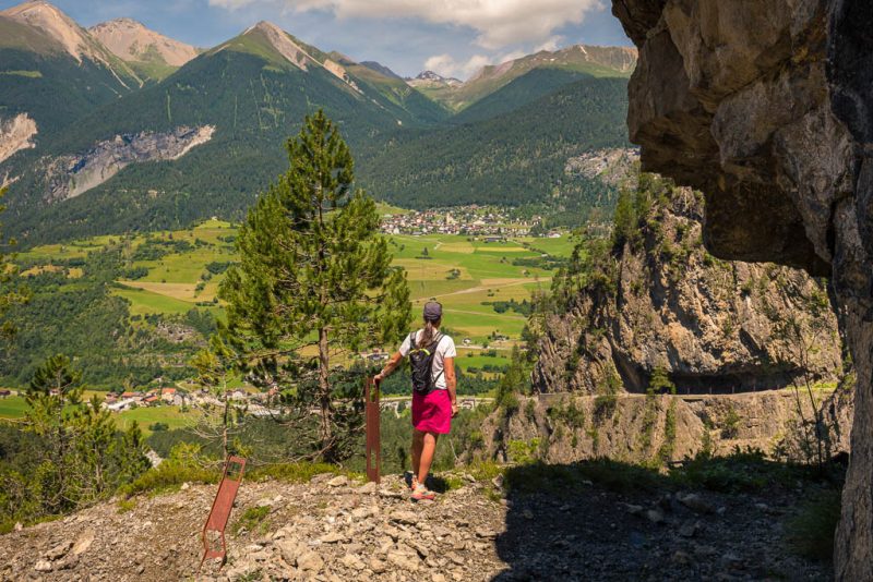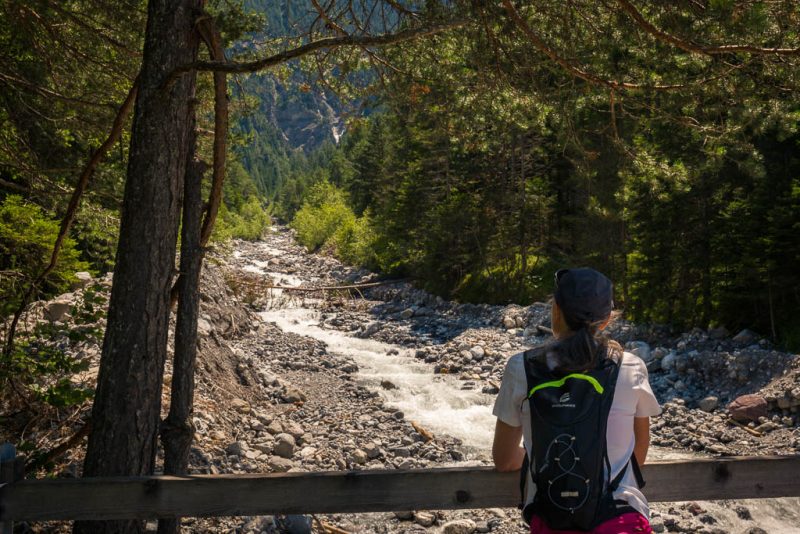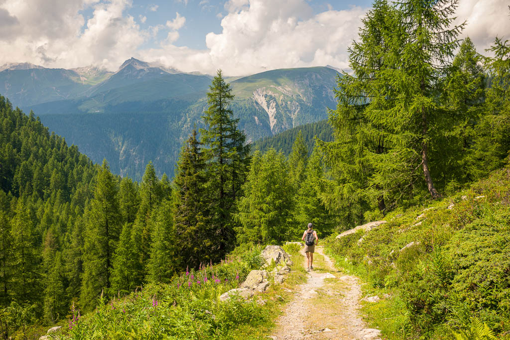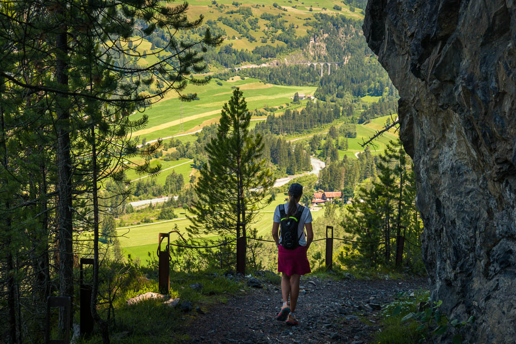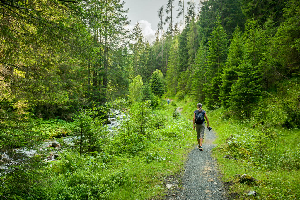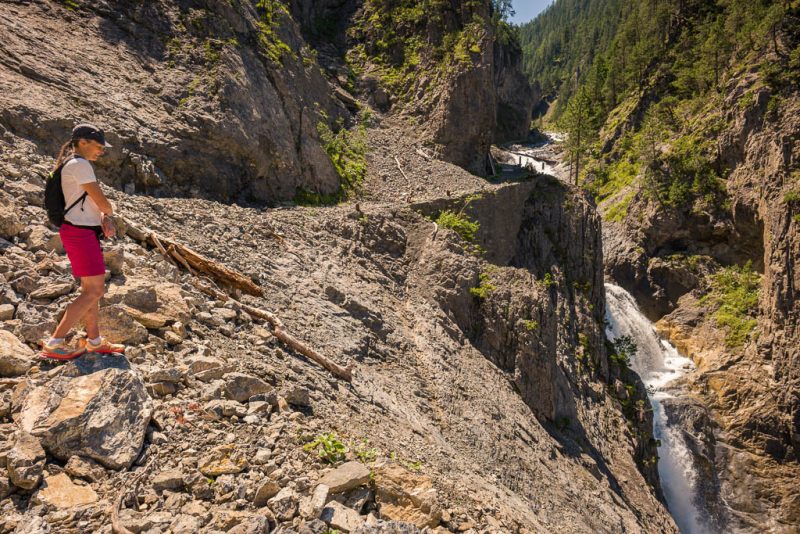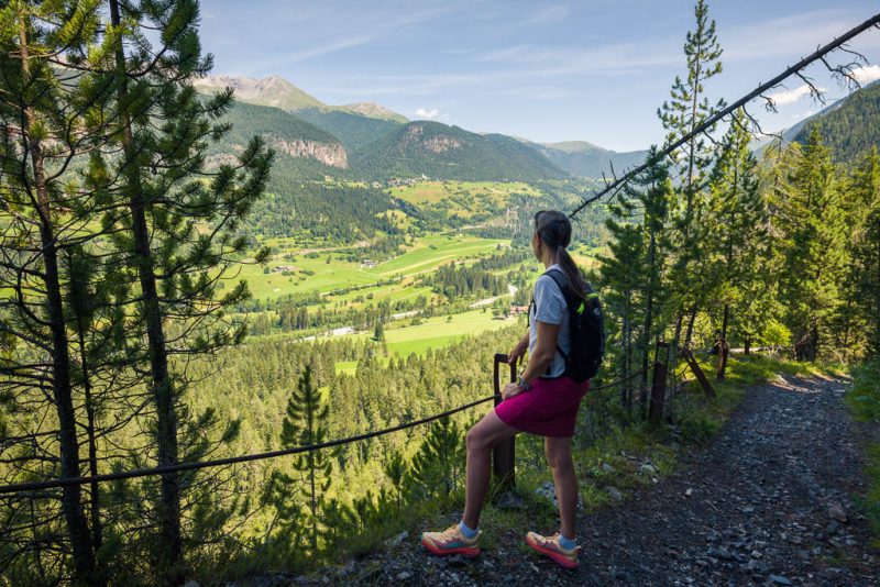 Hier sind wie meist an Sonntagen bzw. schönem Wetter zahlreiche Urlauber unterwegs. Das ändert sich, sobald wir diesen Weg verlassen und dem über Mittelchrüz führenden Weg hinauf ins Ducantal folgen. Ein Blick Richtung Wasserfall zeigt, wohin es die meisten Leute zieht: