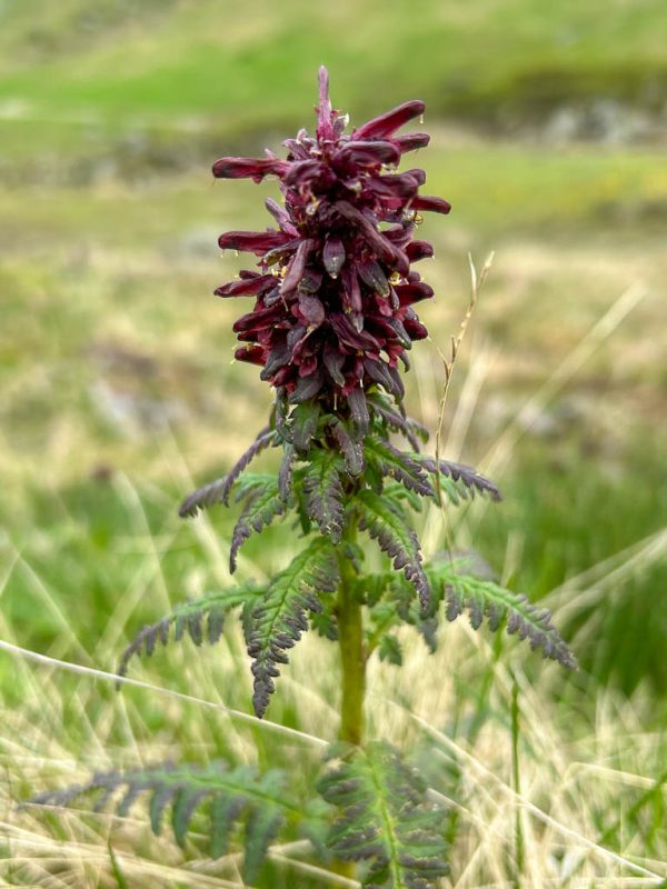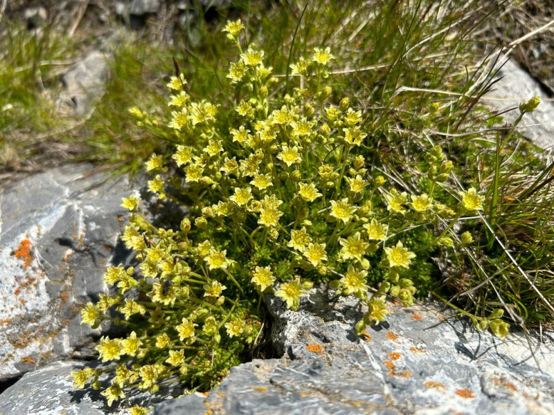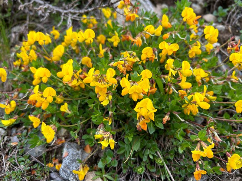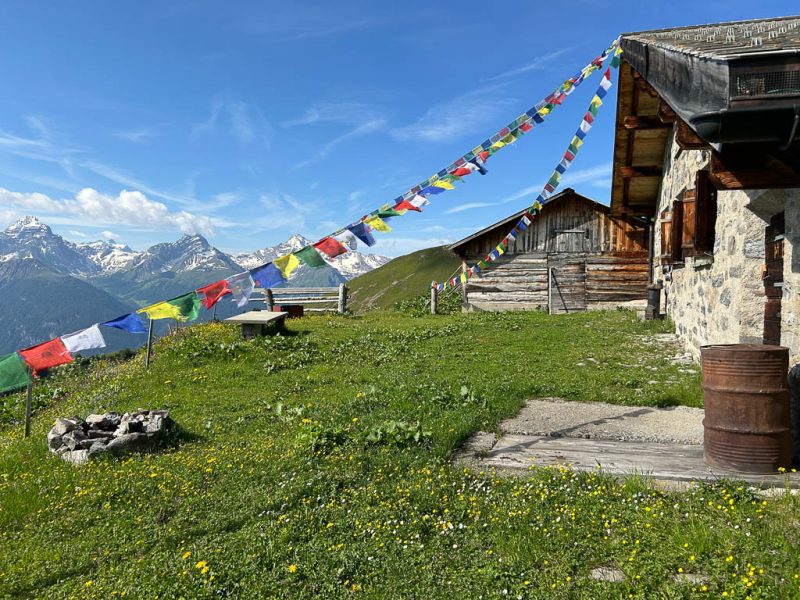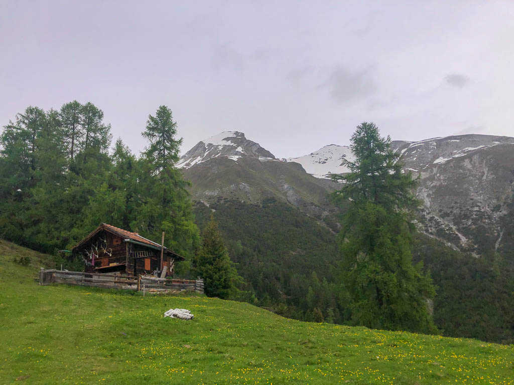 Da gibt es nur eine Lösung: Schuhe ausziehen und barfuß durch den Bach waten. Das ist eine ziemlich abenteuerliche Angelegenheit, denn das im Bachbett liegende Geröll ist glitschig und der Bach an einigen Stellen ziemlich reißend. Aber ich schaffe es, unbeschadet und vor allem mit trockenen Socken und Schuhen auf die andere Seite zu kommen. Die Füße sind nach dem Bad im Bach erst einmal eiskalt, wärmen sich aber in den trockenen Schuhen recht schnell wieder auf. Schon bald erreiche ich den zur Alp da la Creusch führenden Alpweg, folge ihm ein Stück und kürze später den Aufstieg an verschiedenen Stellen ab. Hier geht es weglos an einer Jägerhütte vorbei: