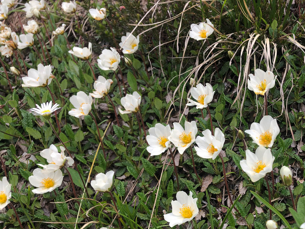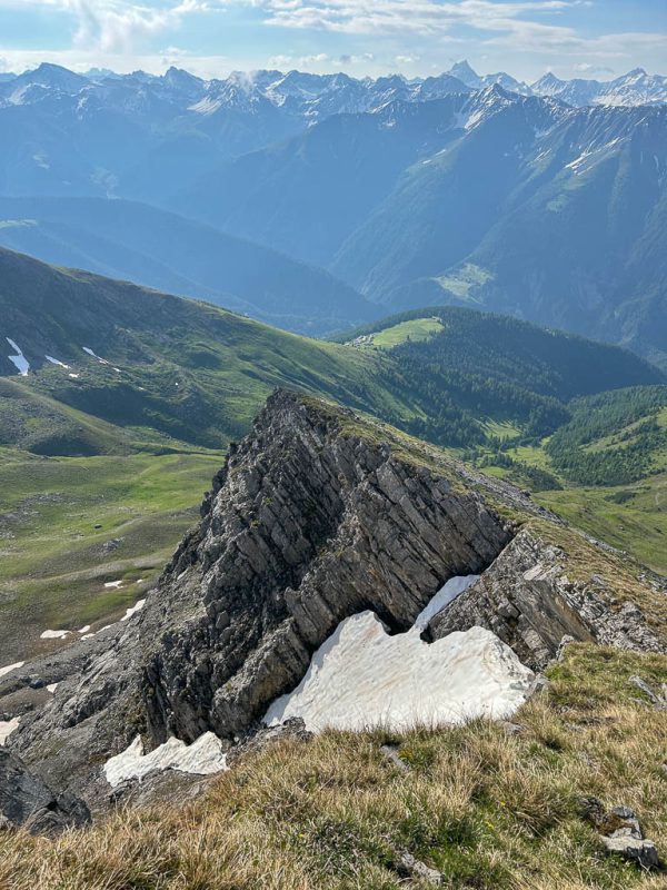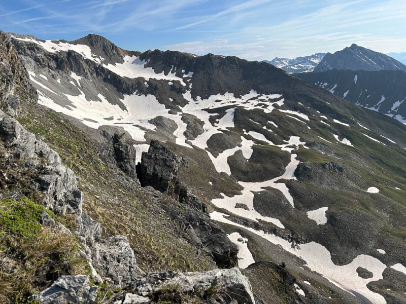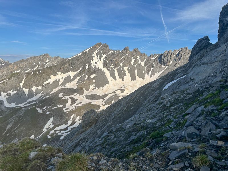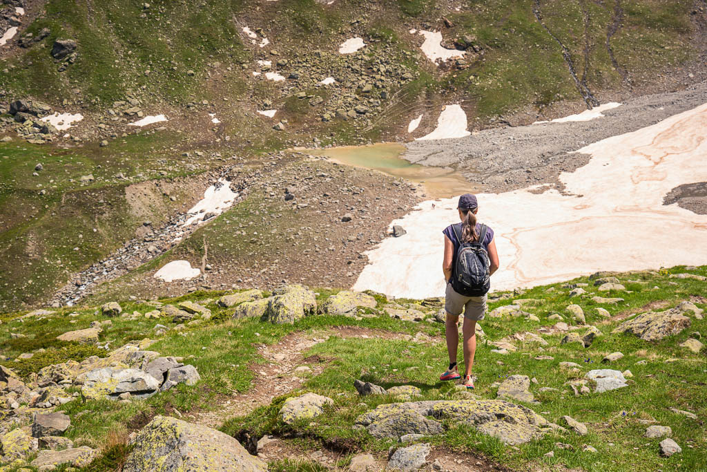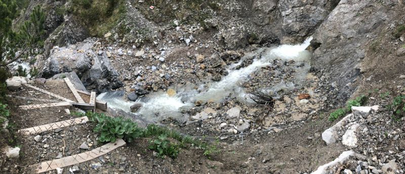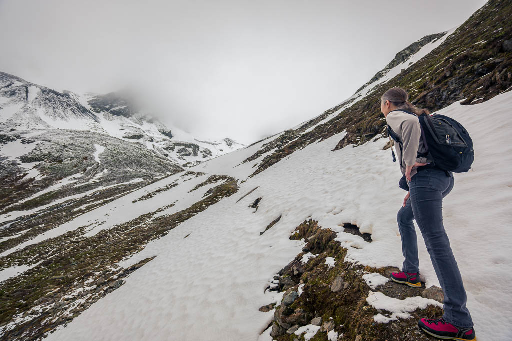 Unter uns liegt ein Schneefeld, das überquert werden muss, ein Schneefeld, unter dem ein Bergbach dahinfließt. Irgendwie fühlt sich das für uns nicht gut an und das, obwohl wir von oben sehen, das zwei Wanderer die Überquerung unbeschadet überstehen. Wir verlassen daher den Wanderweg vor dem Schneefeld: