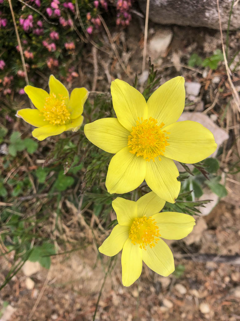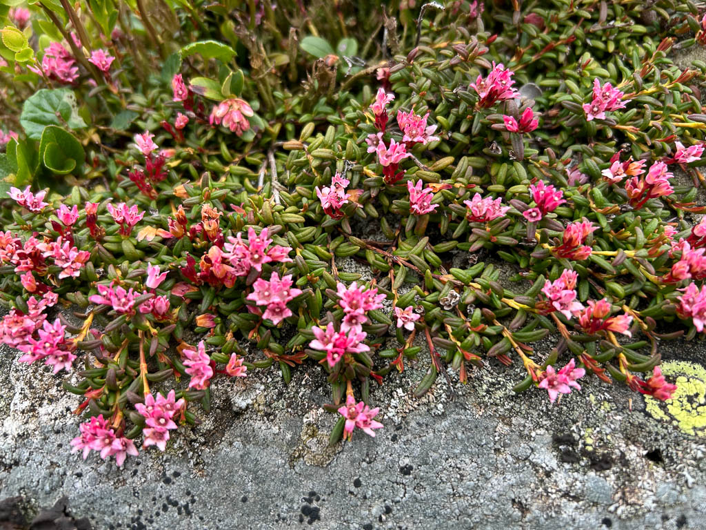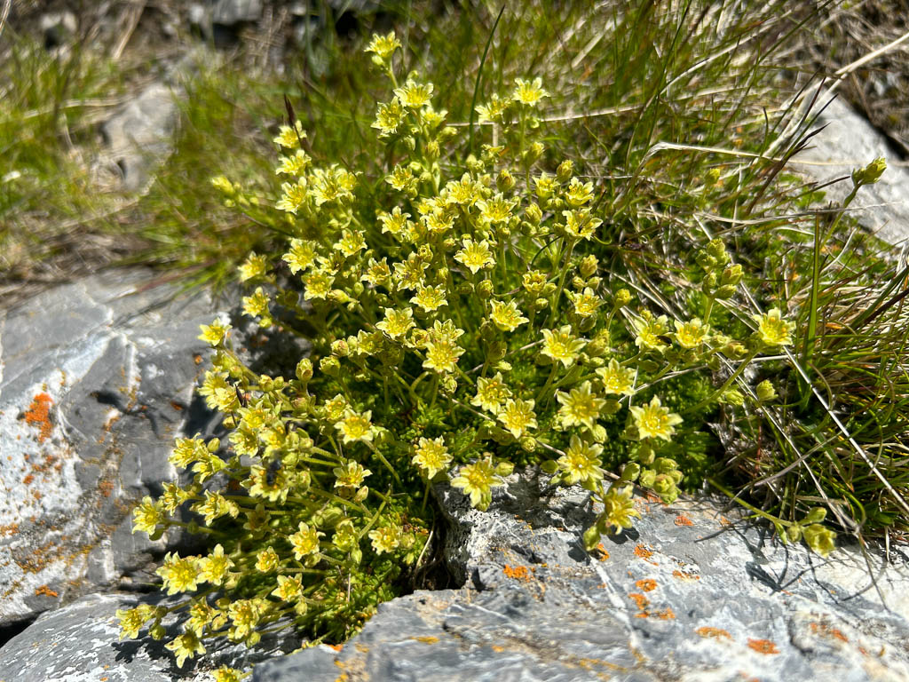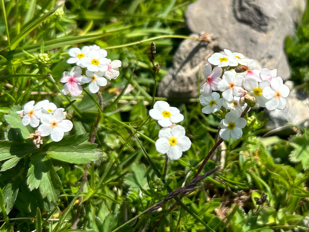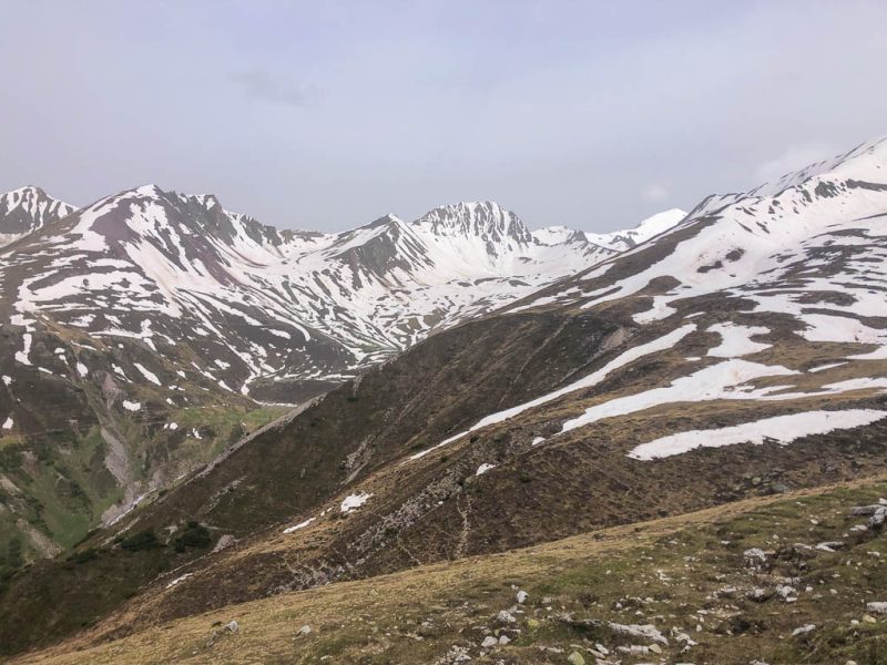 Unter uns liegt ein Schneefeld, das überquert werden muss, ein Schneefeld, unter dem ein Bergbach dahinfließt. Irgendwie fühlt sich das für uns nicht gut an und das, obwohl wir von oben sehen, das zwei Wanderer die Überquerung unbeschadet überstehen. Wir verlassen daher den Wanderweg vor dem Schneefeld: