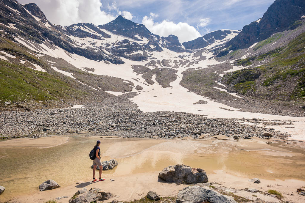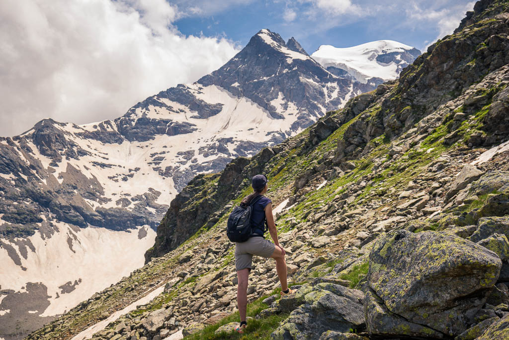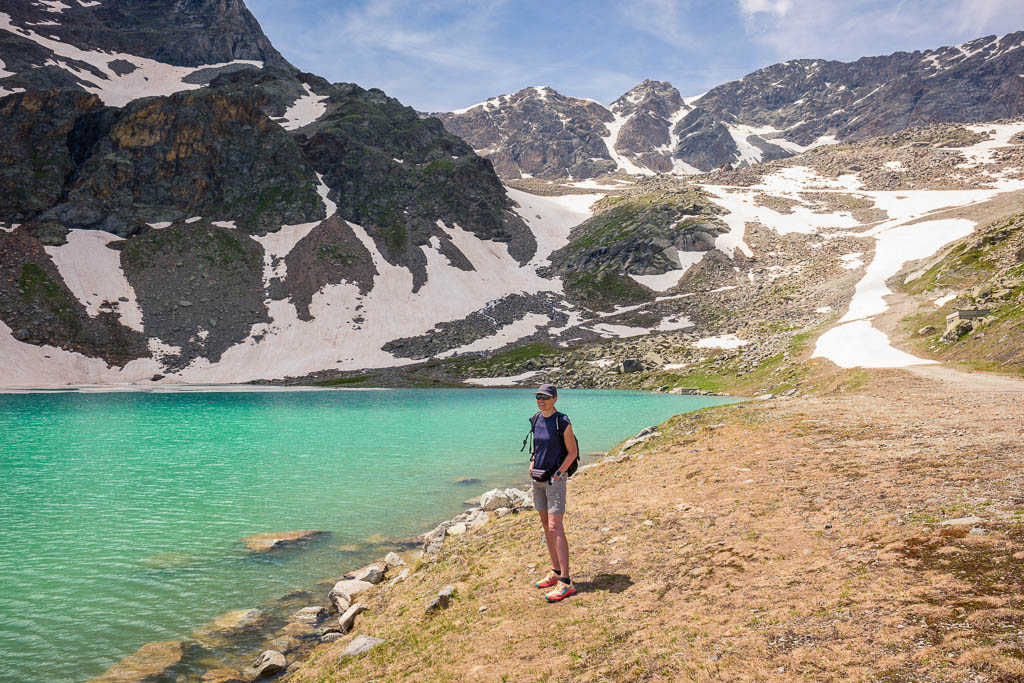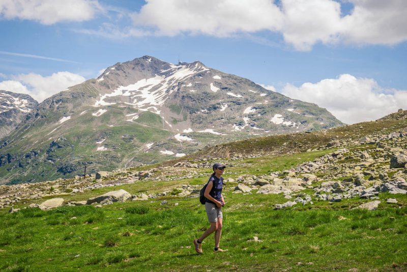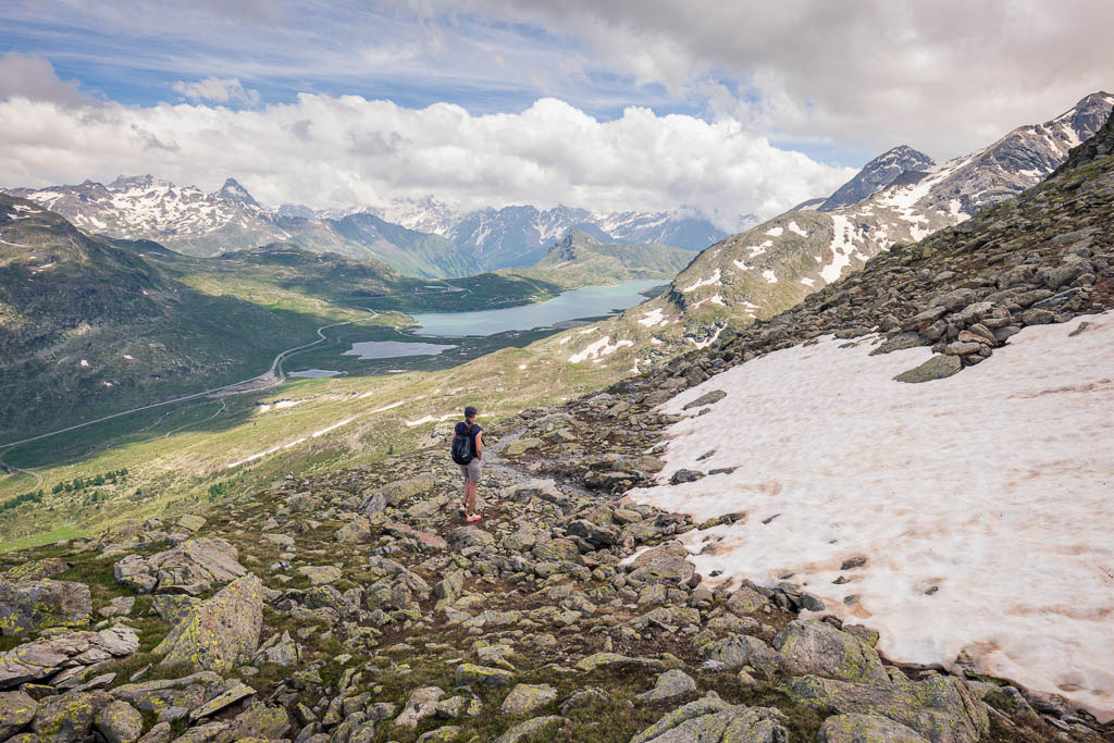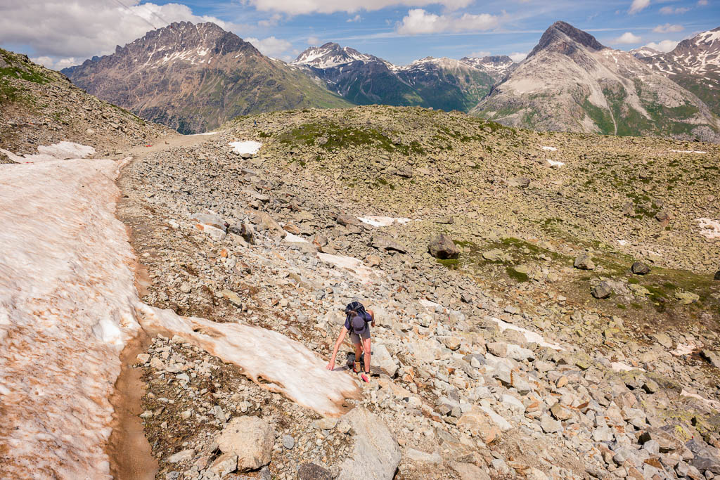 Vom See aus führt ein Wanderweg weiter hinauf zur Diavolezza. Dieser Weg erscheint uns allerdings aufgrund der Wegverhältnisse, das Gelände ist steil, steinig und so wie es aussieht, zum größten Teil schneebedeckt, nicht empfehlenswert. Wir laufen daher auf dem Wanderweg, der zum „Ospizio Bernina“ führt, weiter. Erst müssen wir allerdings den Ova da Diavolezza überwinden: