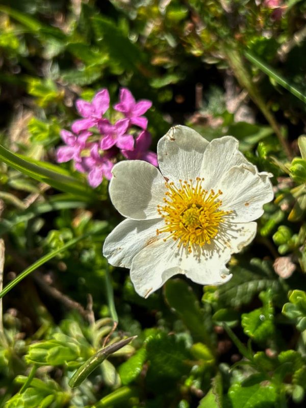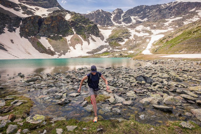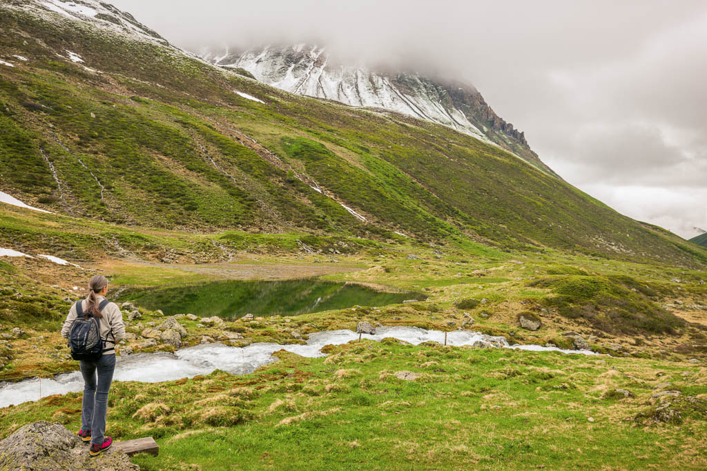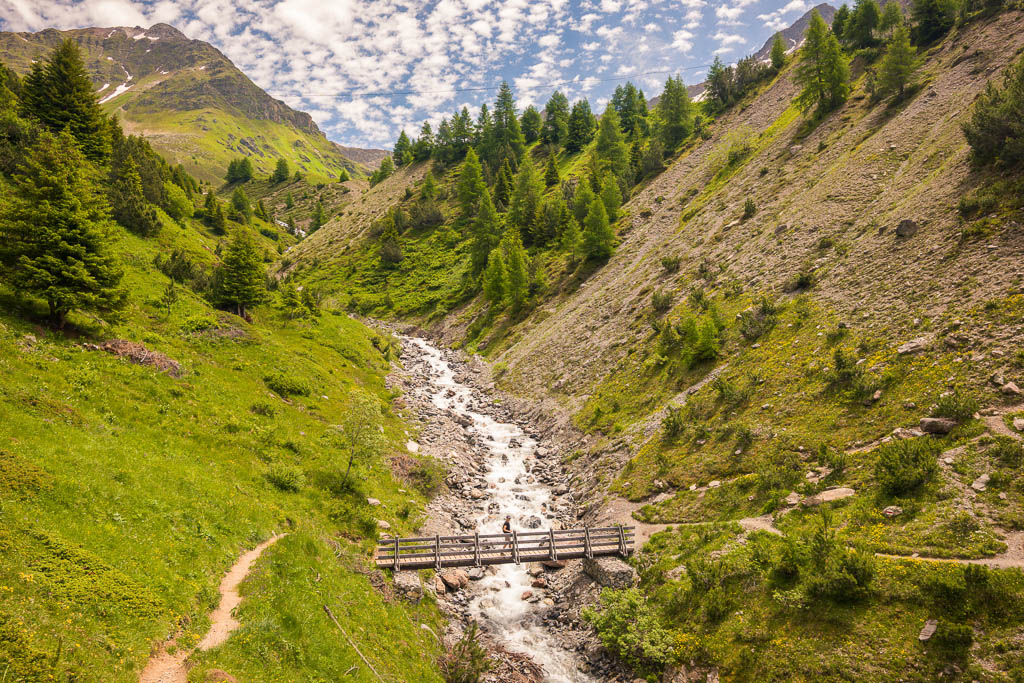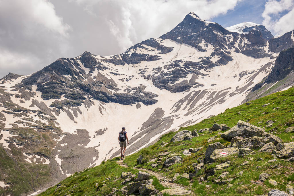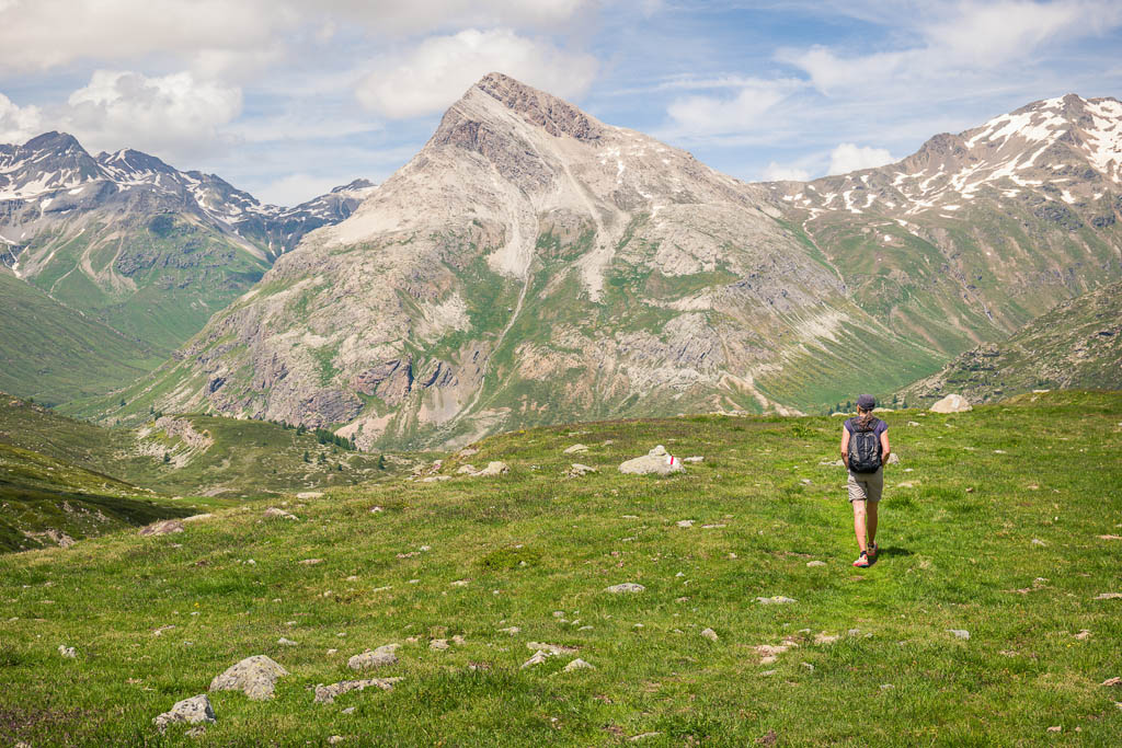Vom See aus führt ein Wanderweg weiter hinauf zur Diavolezza. Dieser Weg erscheint uns allerdings aufgrund der Wegverhältnisse, das Gelände ist steil, steinig und so wie es aussieht, zum größten Teil schneebedeckt, nicht empfehlenswert. Wir laufen daher auf dem Wanderweg, der zum „Ospizio Bernina“ führt, weiter. Erst müssen wir allerdings den Ova da Diavolezza überwinden: