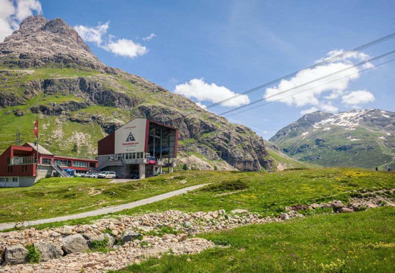 Die Motivation, heute etwas Größeres zu unternehmen, hält sich aufgrund der vorhergesagten, recht sommerlichen Temperaturen in Grenzen. Aber gegen eine kleine Wanderung in höheren Lagen ist nichts einzuwenden. Wir fahren daher mit Bus und Bahn nach „Bernina Diavolezza“ und wandern von dort aus zum Lej da Diavolezza. Die meisten anderen Gäste der Diavolezza (rätoromanisch: Teufelin) und von denen gibt es heute zahlreiche, fahren mit der Gondel hinauf zum Berghaus „Diavolezza“. Wir sind auf unserem Weg nach oben allein unterwegs. Die Talstation der Gondel: