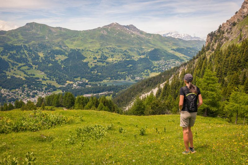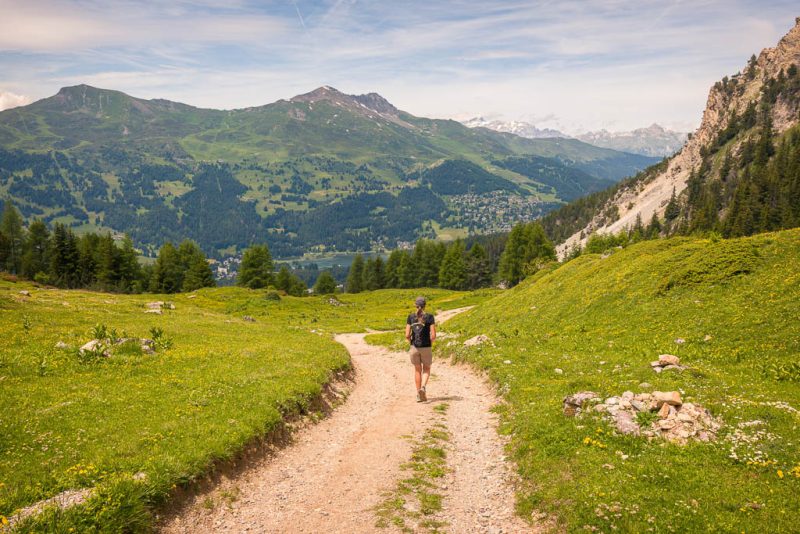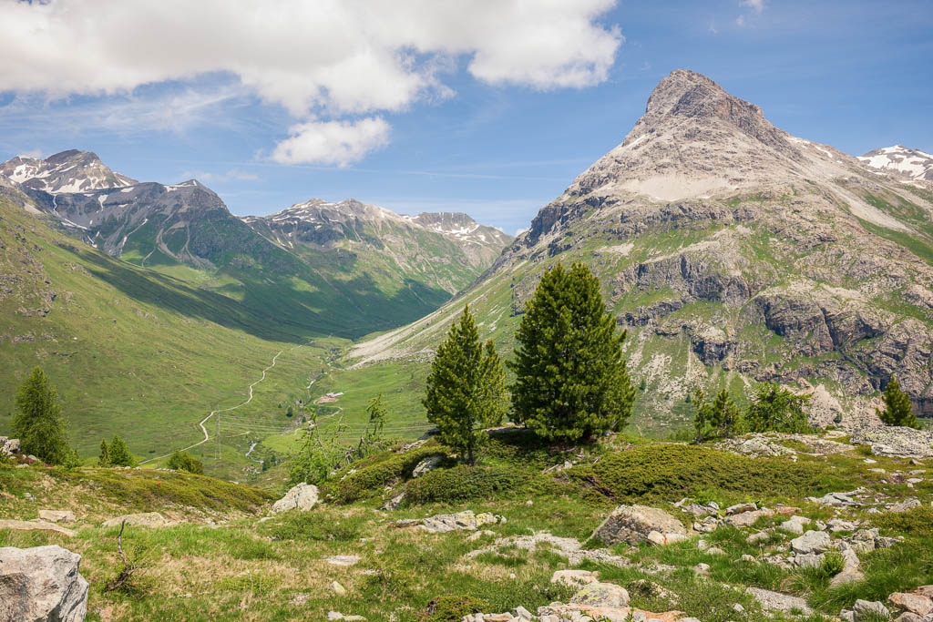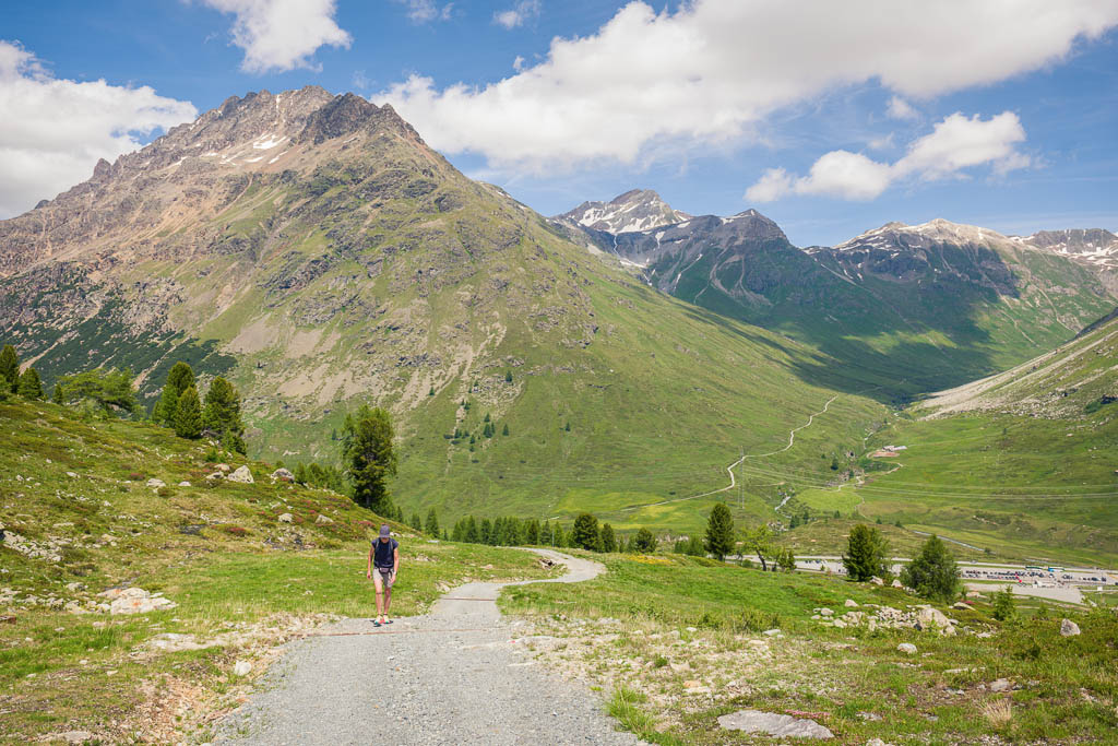 Der steile Weg nach oben, rechts unten im Bild ist der Parkplatz der Diavolezzabahn, in der Bildmitte das „Val da Fain“ und links Piz Albris zu sehen: