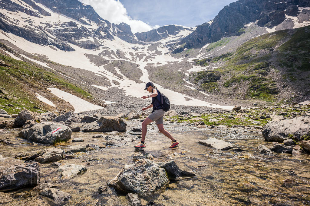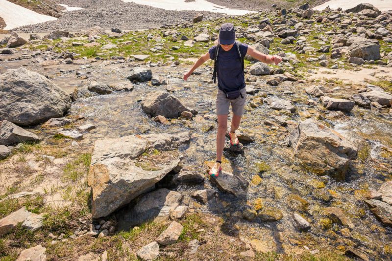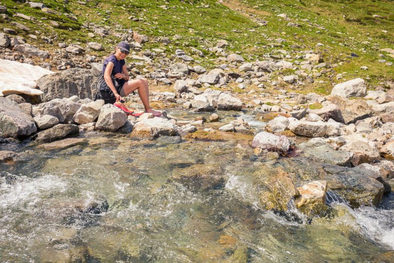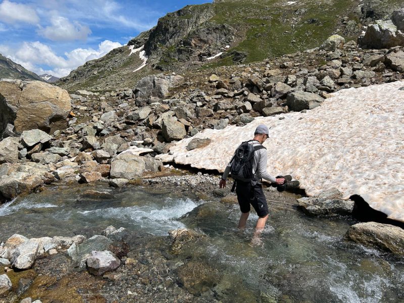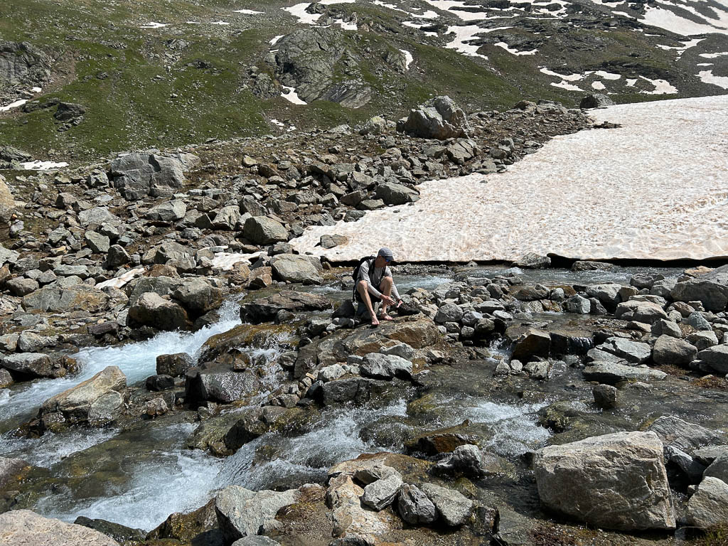 Und überqueren den Bergbach an der Stelle, an der er unten dem Schnee hervortritt. Um keine nassen Füße zu bekommen, müssen wir hier die Schuhe ausziehen: