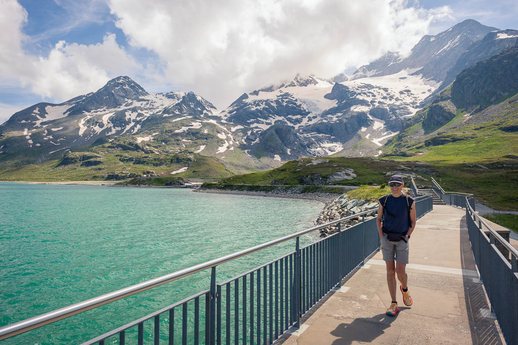 Der Lago Bianco verdankt seine Farbe und seinen Namen der Gletschermilch aus dem Cambrena-Gletscher. Auf der Staumauer des Lago Biancos, hinter mir ist der Cambrena-Gletscher zu sehen: