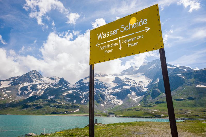 An der Staumauer des Lago Bianco liegt die Wasserscheide zwischen Süden und Osten. Während das Wasser aus dem Lago Bianco ins Mittelmeer fliesst, sucht sich das Wasser des Lej Nair über den Inn und die Donau den Weg ins Schwarze Meer: