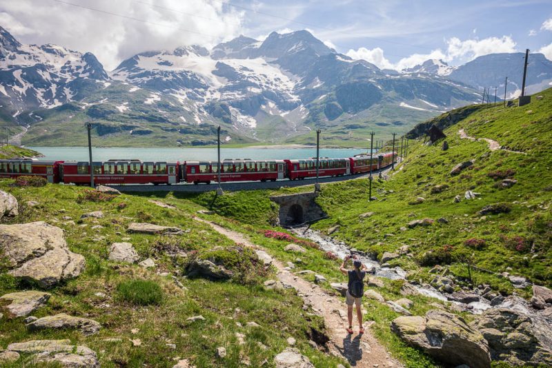 Kurz vor Erreichen der Bahnstation „Ospizio Bernina“ fährt der Bernina-Express an uns vorbei: